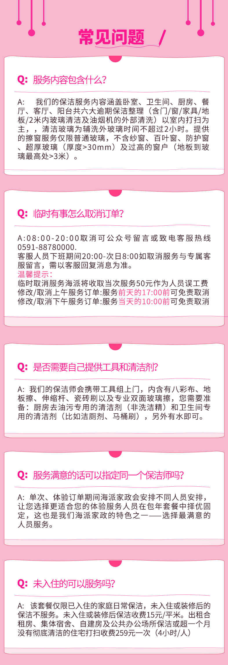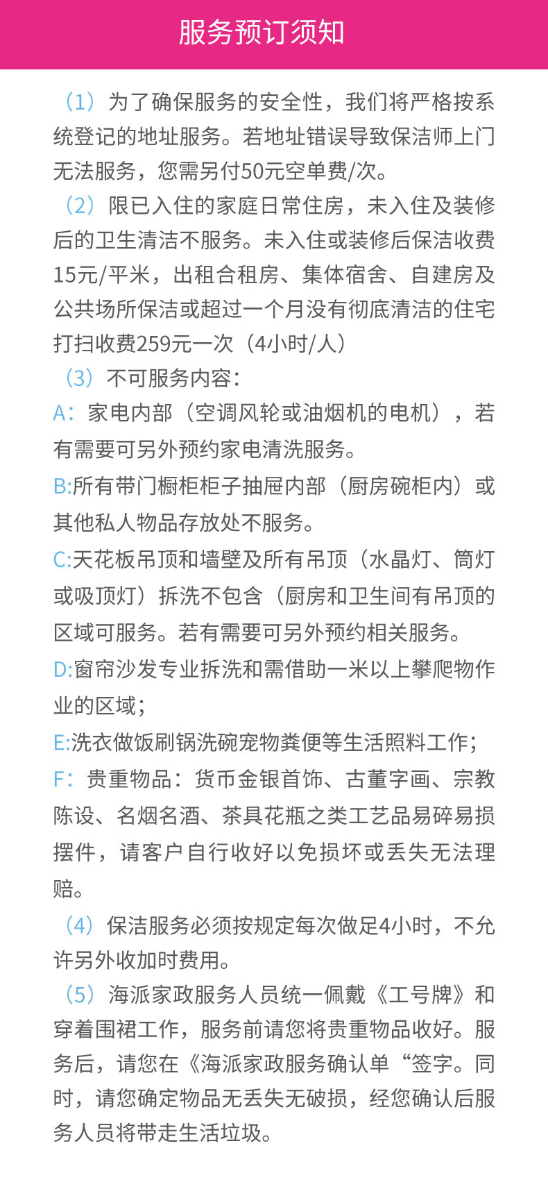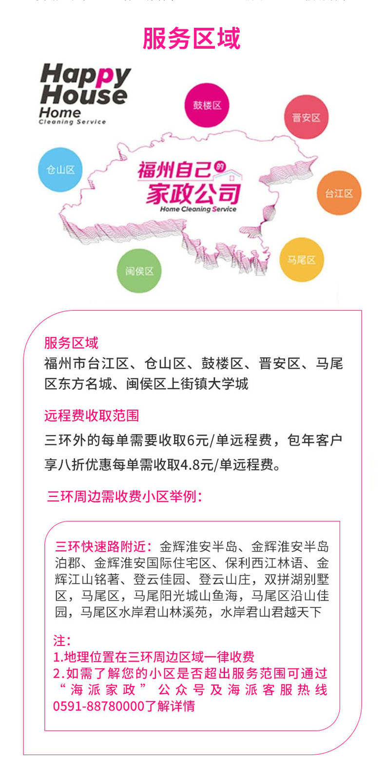 1.家庭保洁服务范围限福州市区。新房开荒、自建房暂不提供服务,交通不方便地方及个别离公交站距离远的地方不保证能安排;
