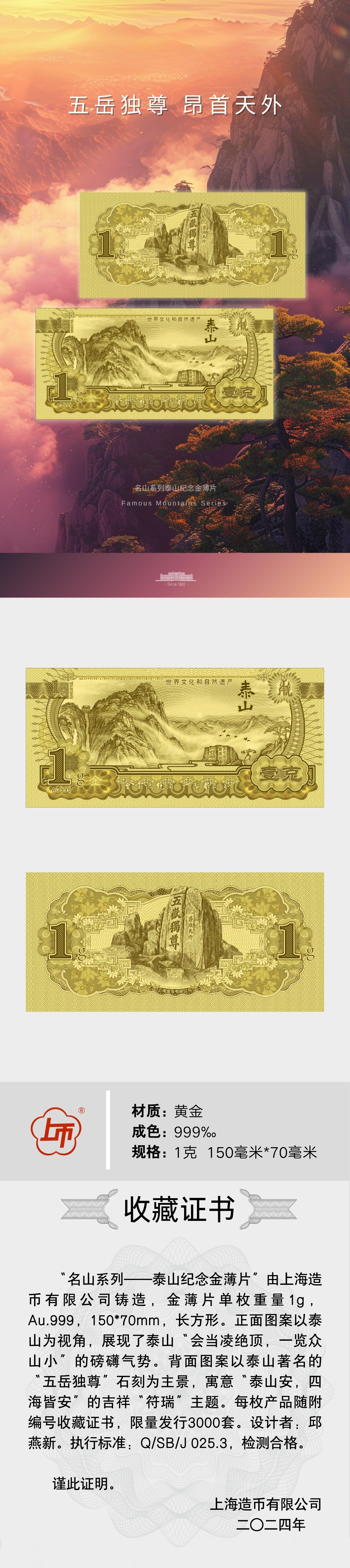 名山系列——泰山纪念金薄片(1克)