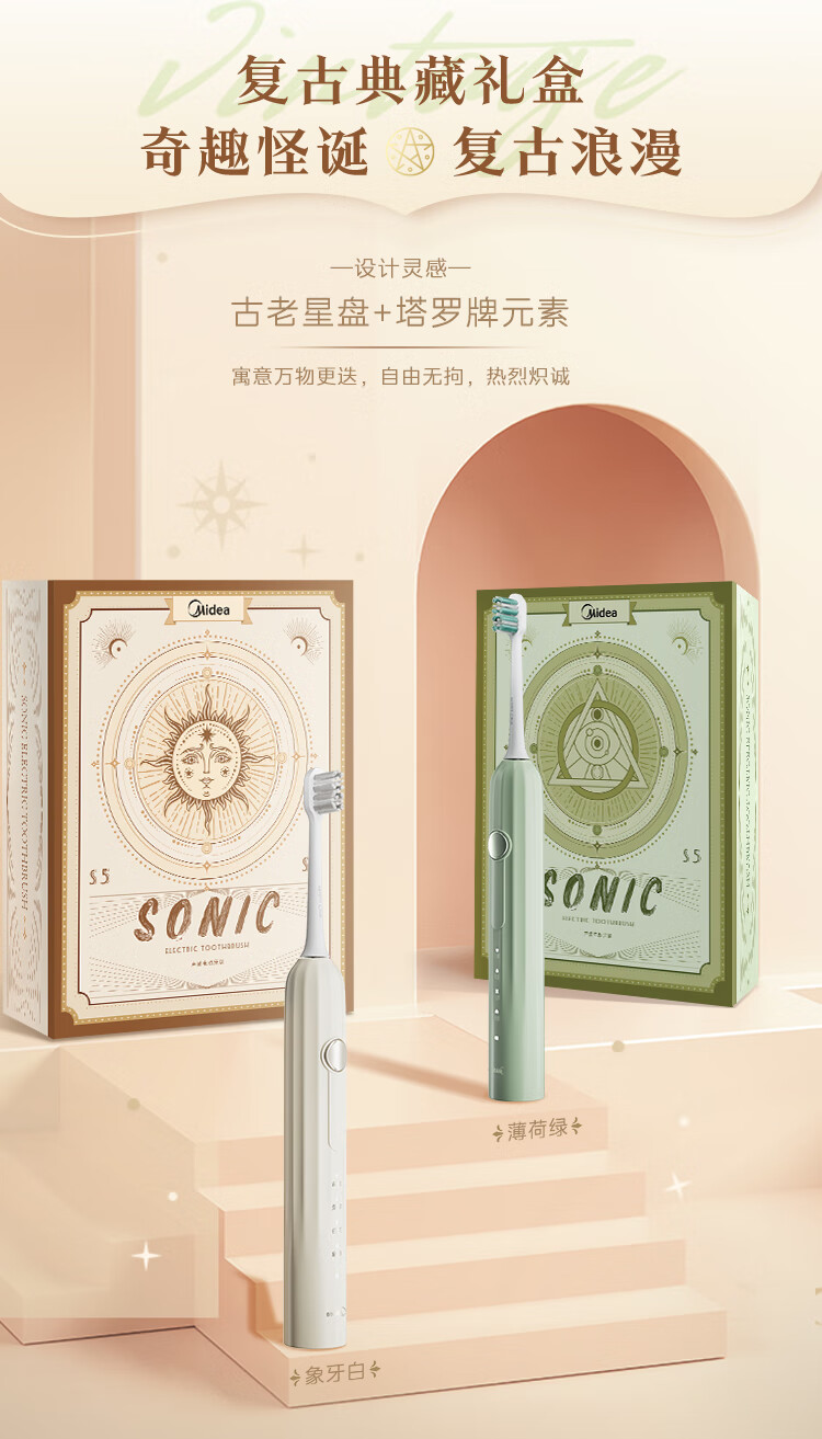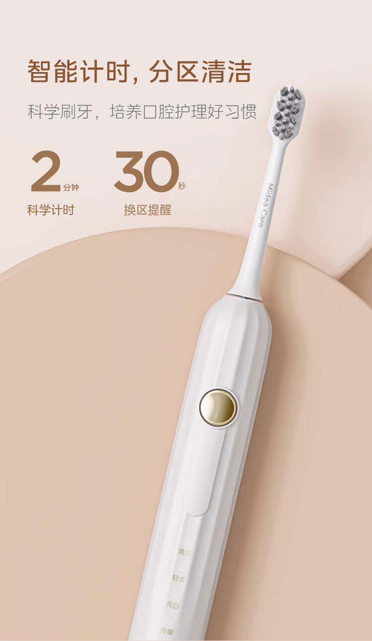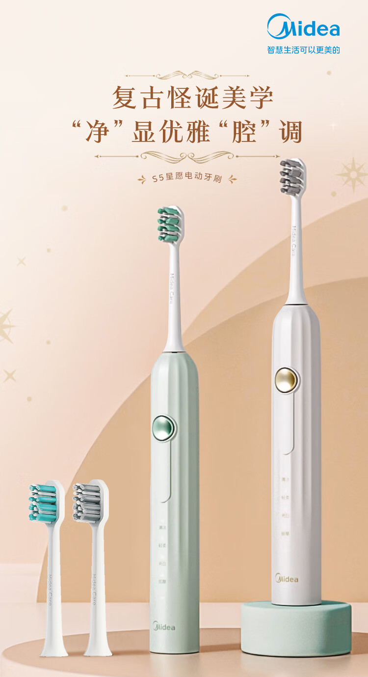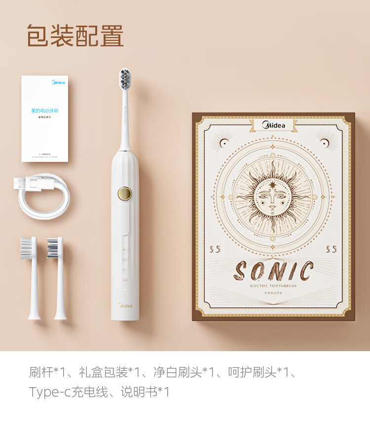 美的(Midea)S5 电动牙刷成人 声波震动 220天长续航 智能换区提醒 软毛刷头*2 情侣款 礼物