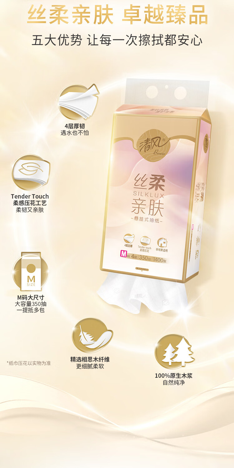 清风丝柔系列 包悬挂式抽纸4层350抽/提