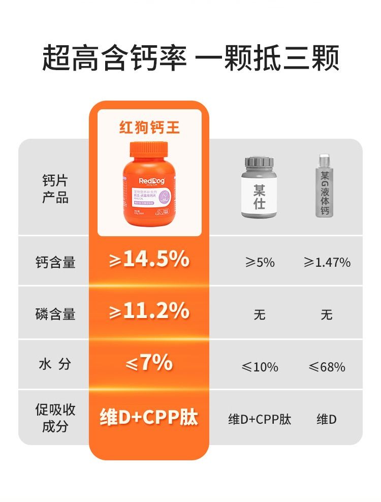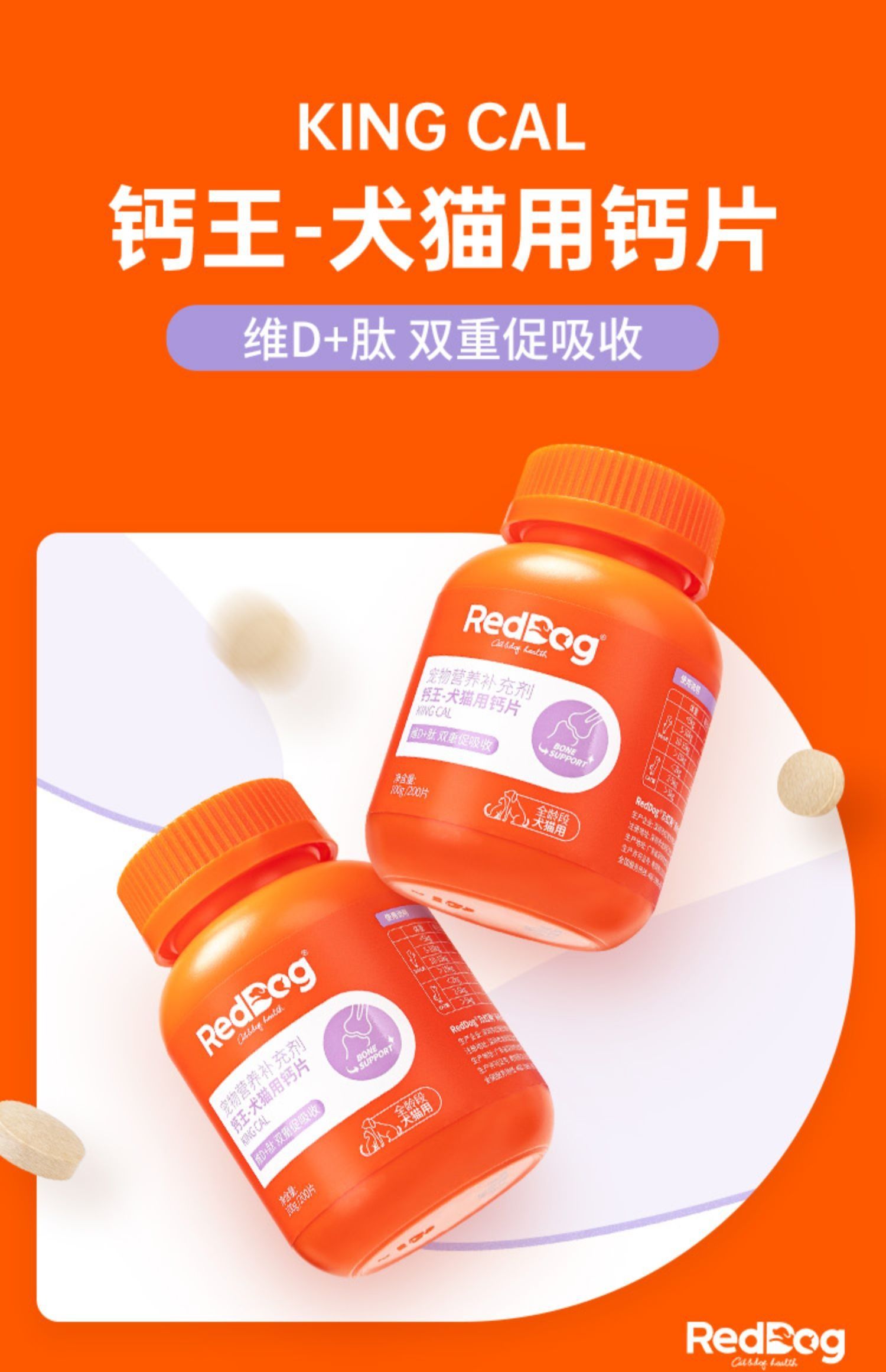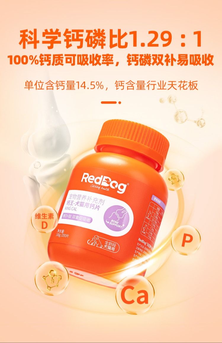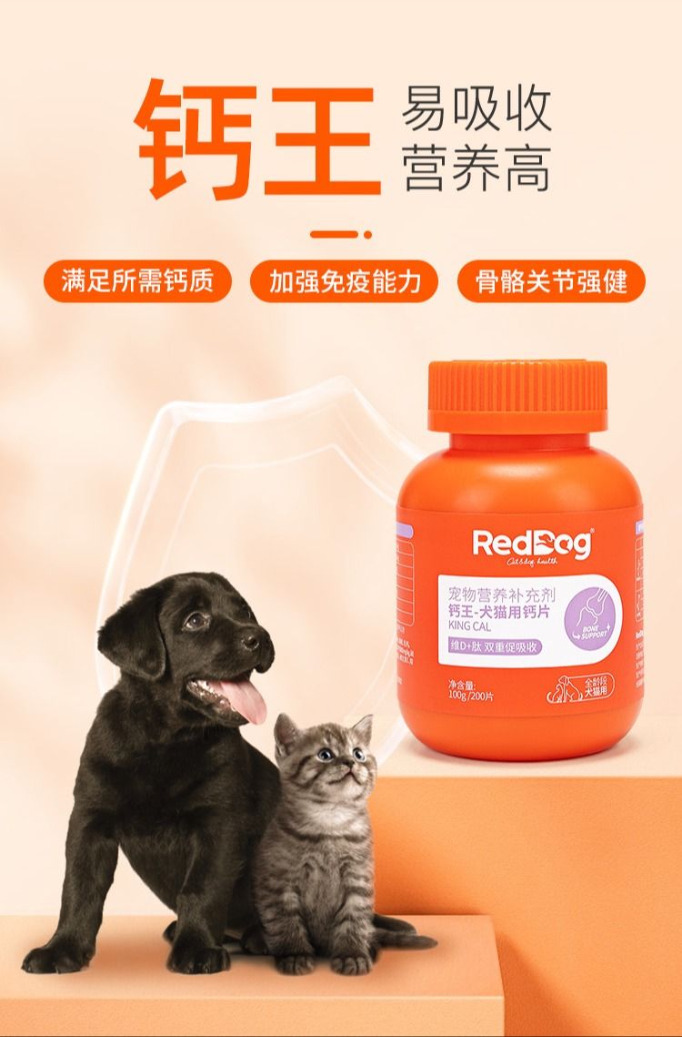 红狗钙王宠物钙片猫咪健骨补钙狗狗关节维生素D营养200片/瓶