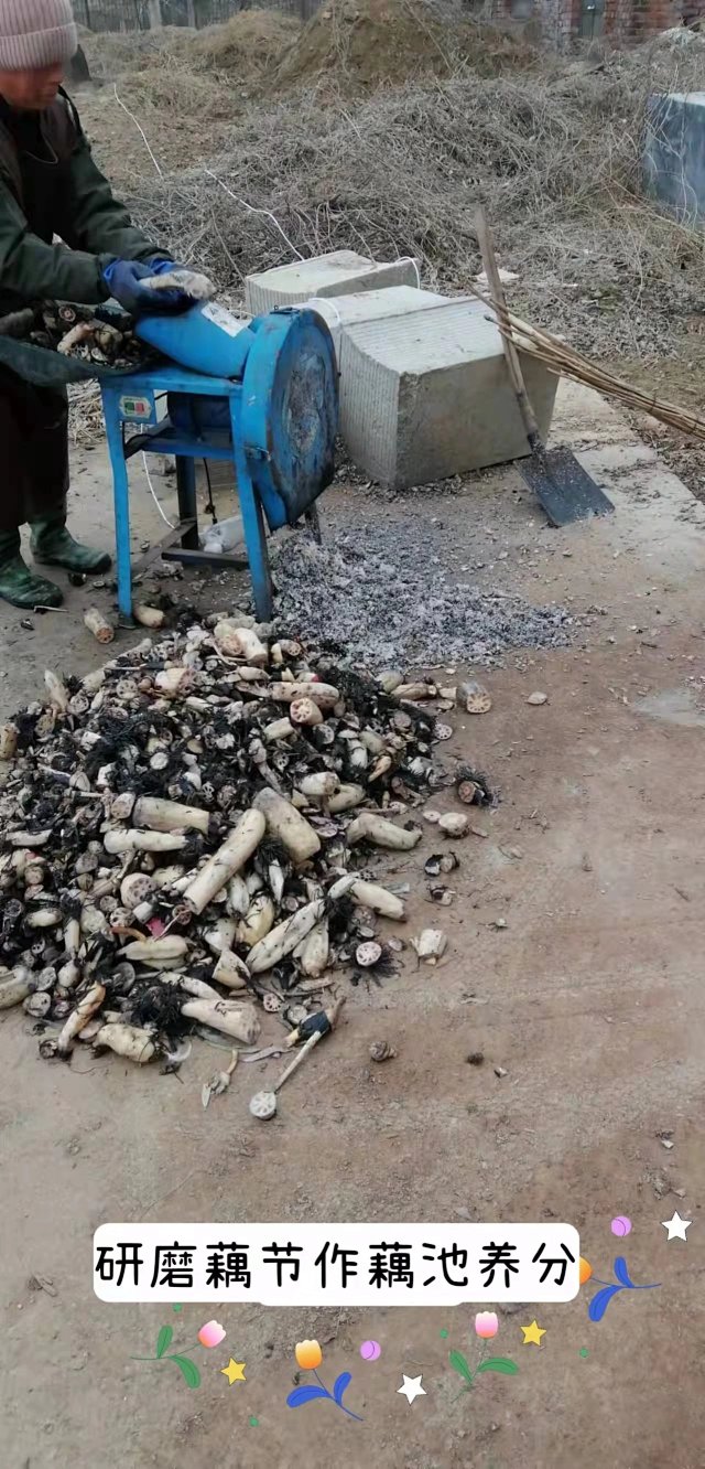 制作各种菌肥:研磨机研磨藕节、叶、茎倒入环保绿色肥料池自然发酵。