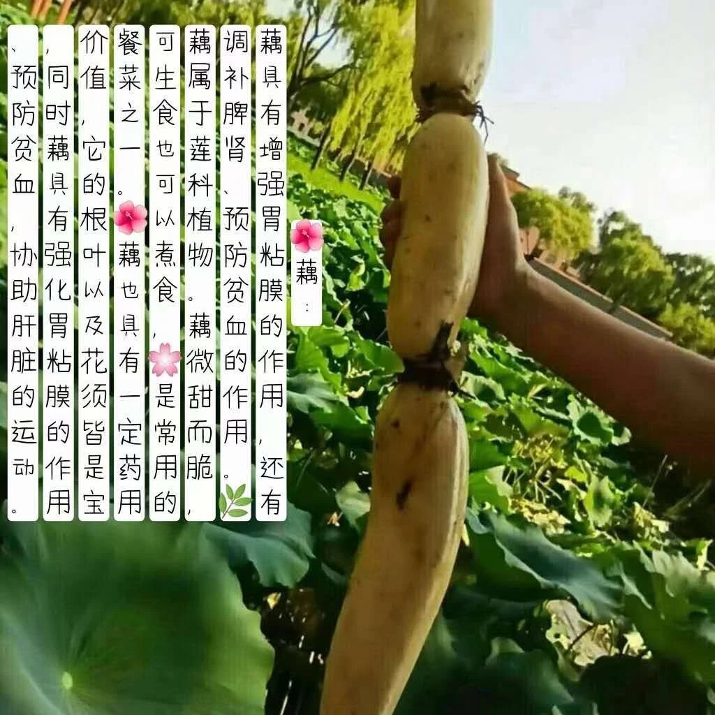 【种植方式】采用传统种植方法,在种植过程中不使用农药、化肥、漂白剂和添加剂等化学物质,遵循自然生态的种植方法,保证了莲藕的天然品质。