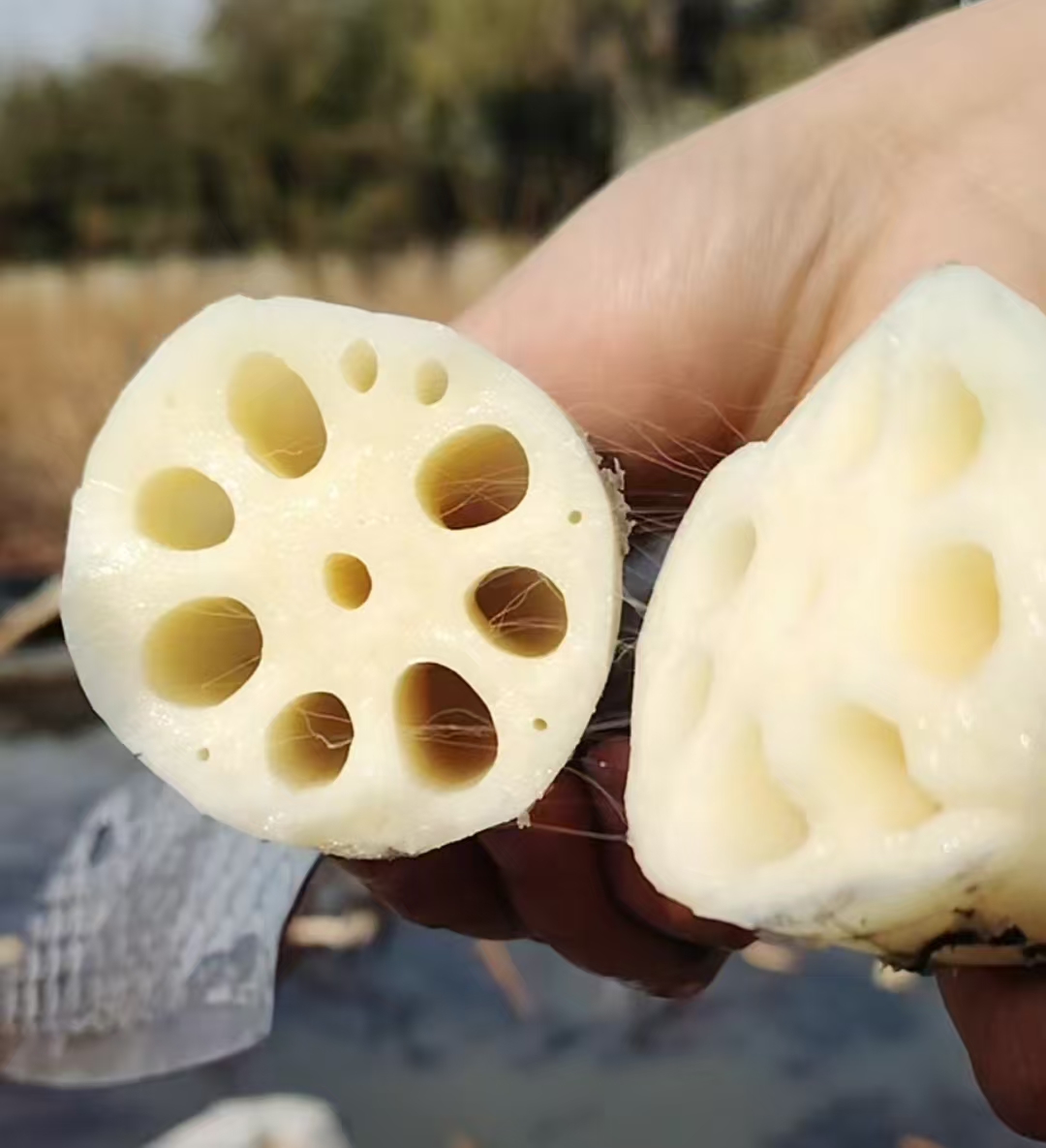 原生态山东东平九孔白莲藕,生长于山东省泰安市东平县商老庄乡天思福慧康养中心的莲花池里,莲花池环境优美,四周柳树成荫,周围没有工厂,没有污染。