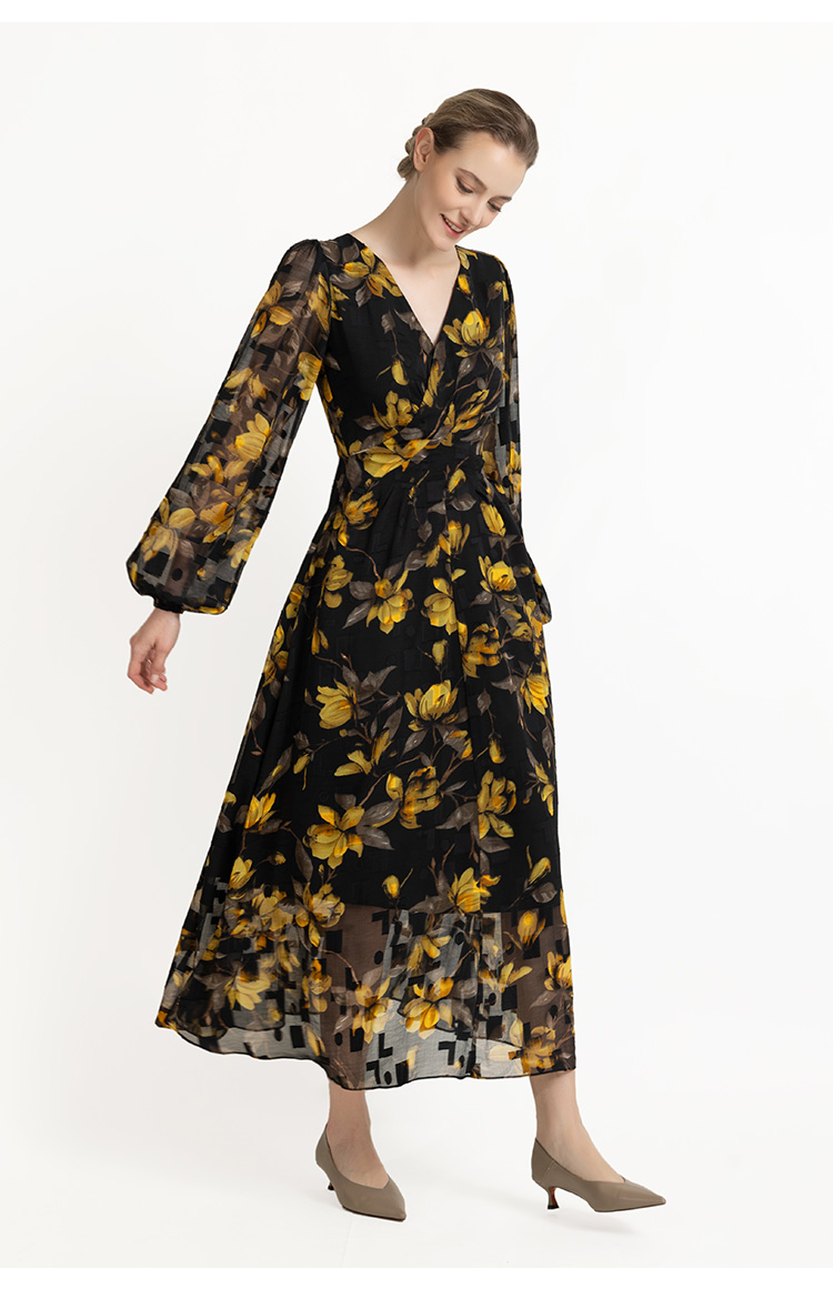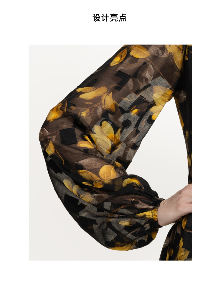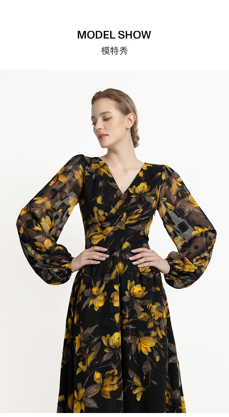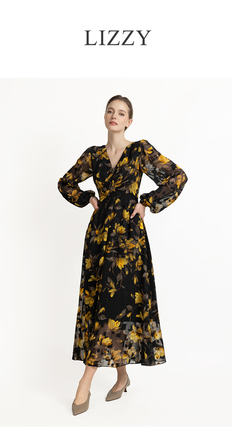 LIZZY 优雅浪漫印花V领灯笼长袖高腰大摆设计感连衣裙7919