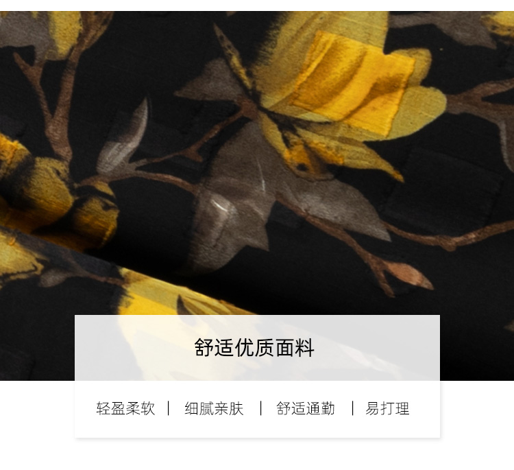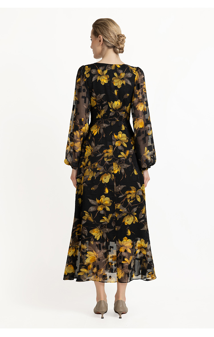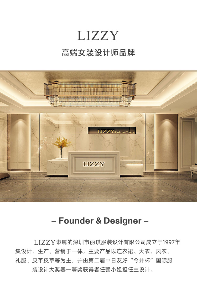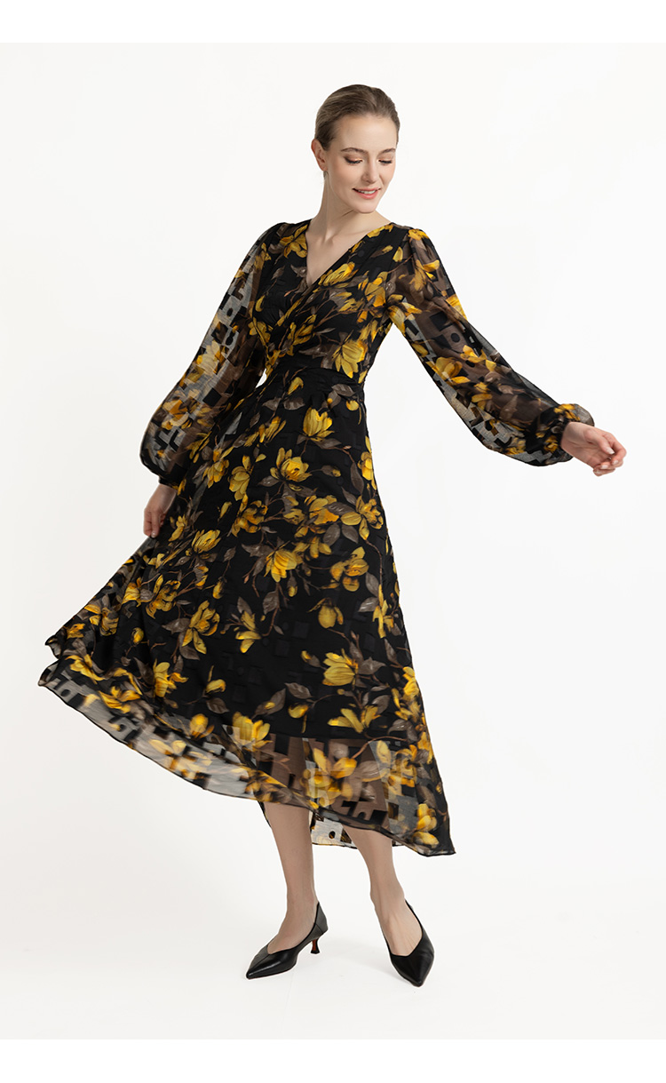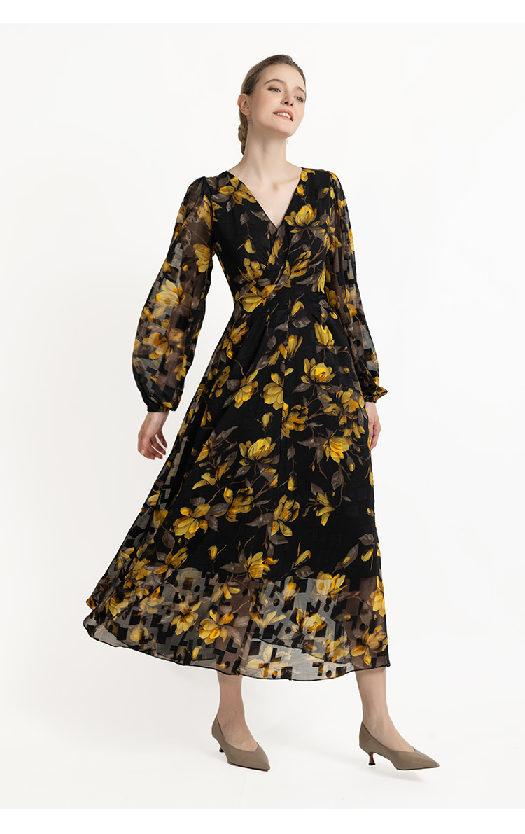 LIZZY 优雅浪漫印花V领灯笼长袖高腰大摆设计感连衣裙7919