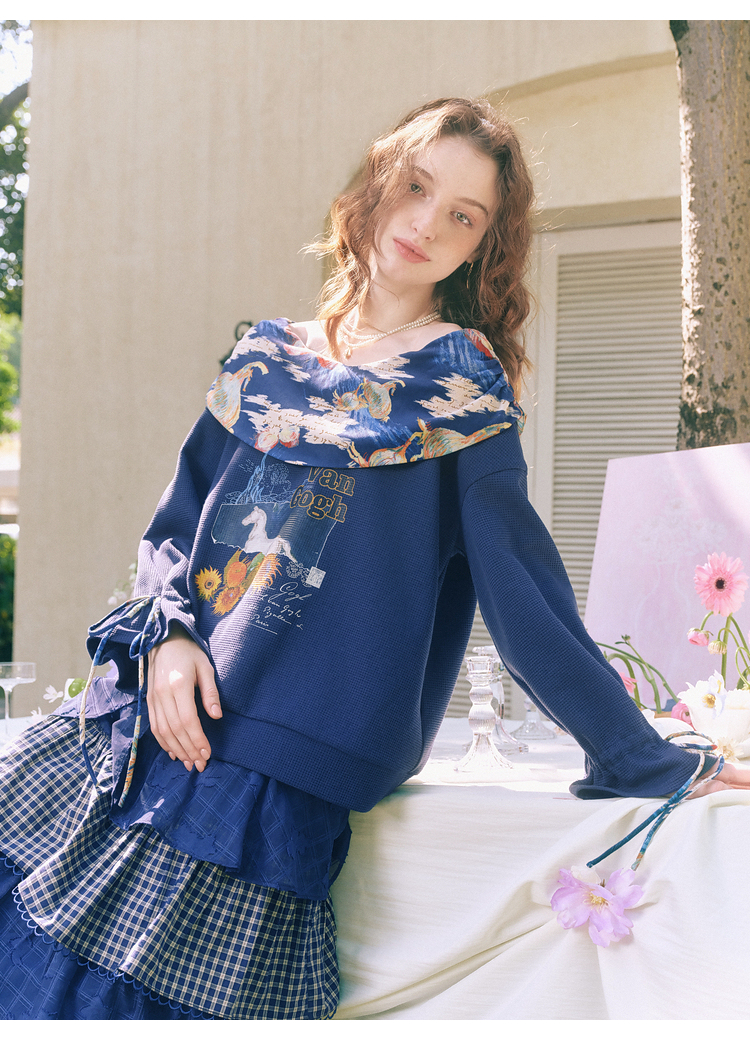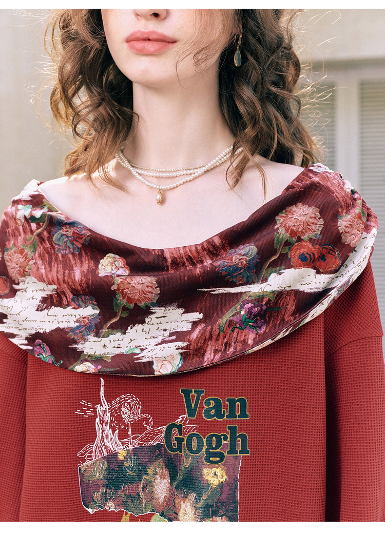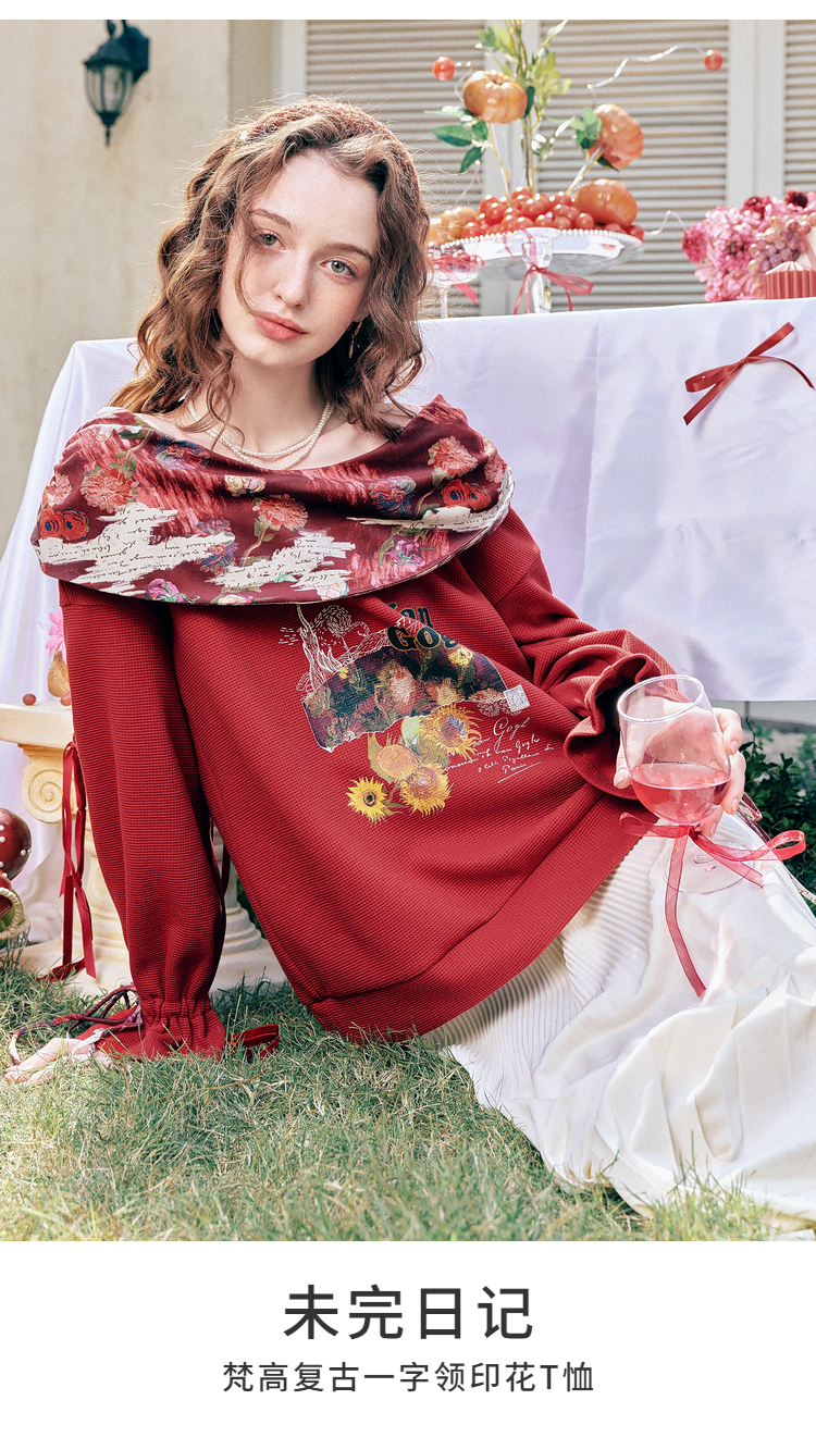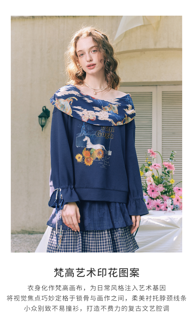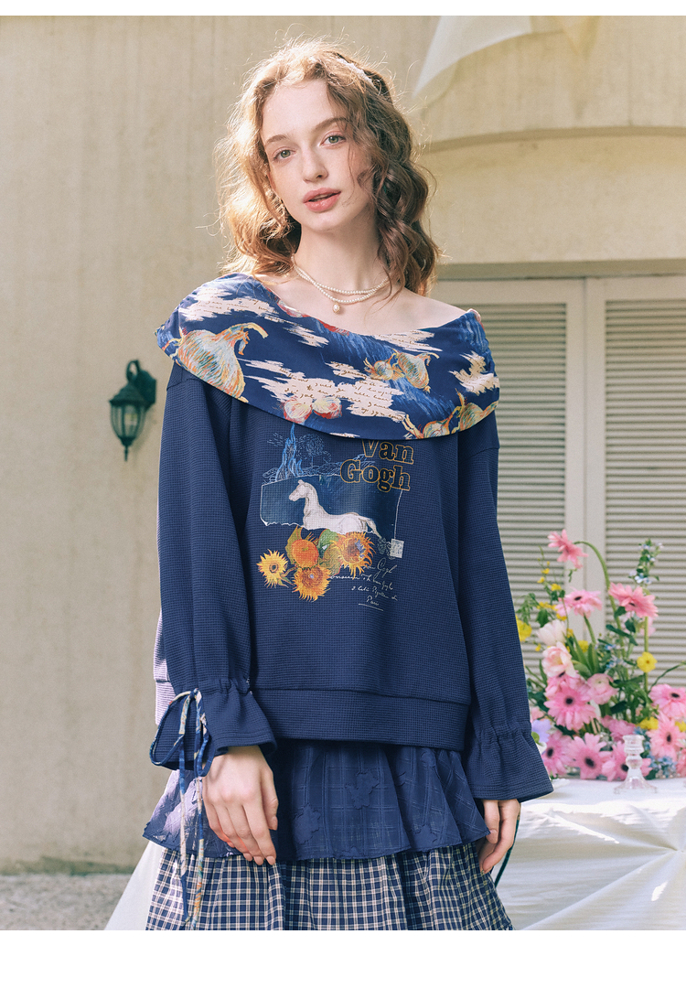 两三事梵高文艺未完日记2026春新款甜美一字肩大翻领印花t恤女