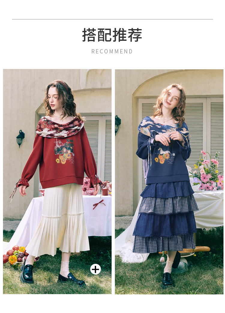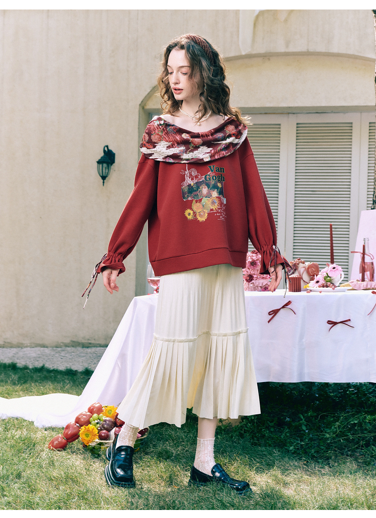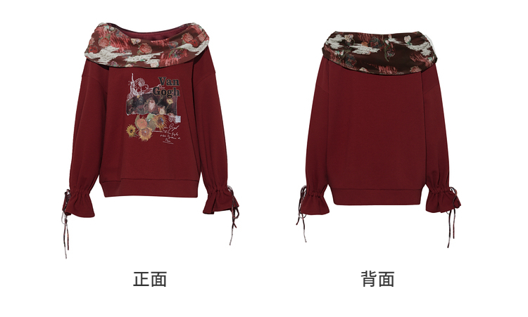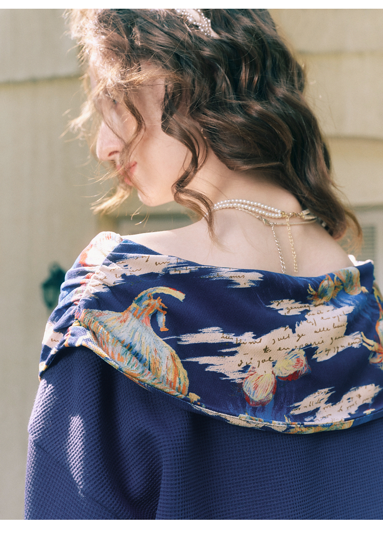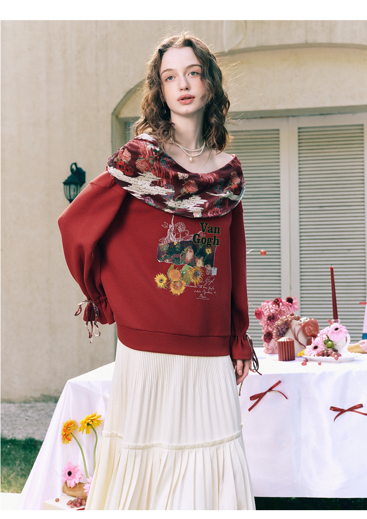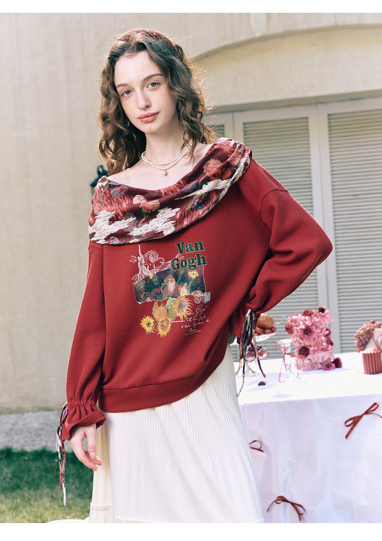 两三事梵高文艺未完日记2026春新款甜美一字肩大翻领印花t恤女