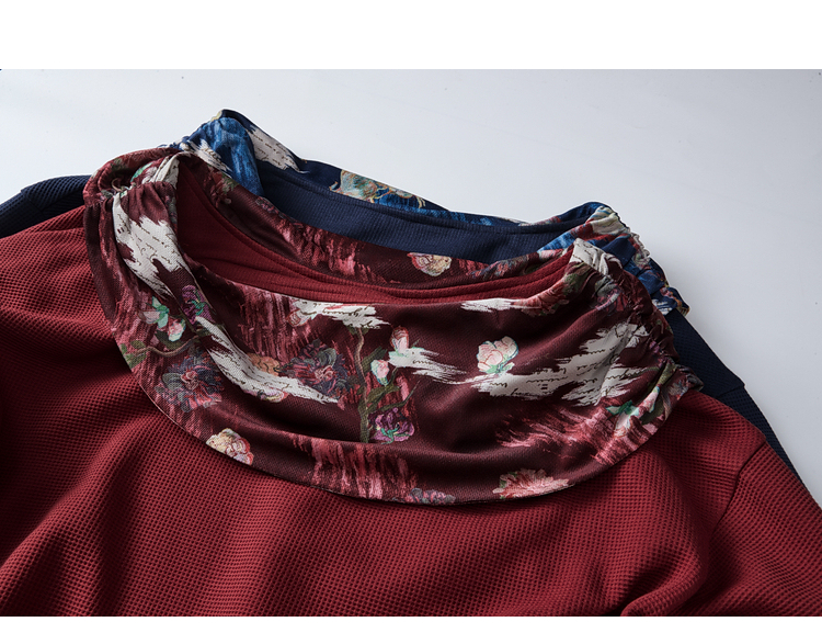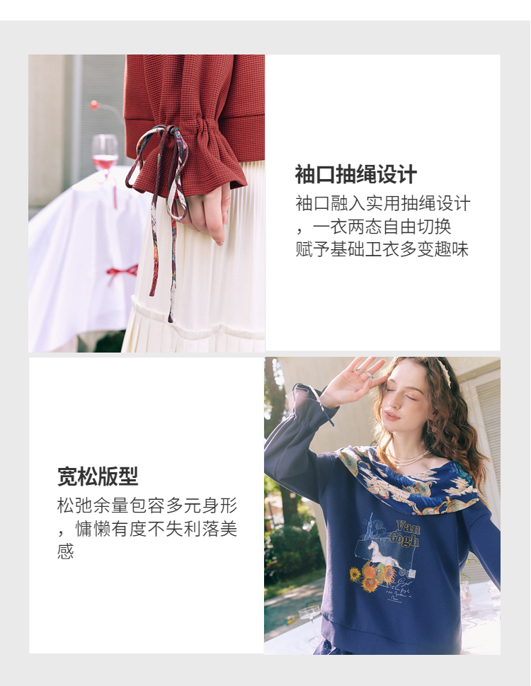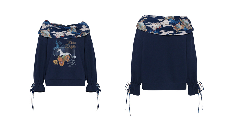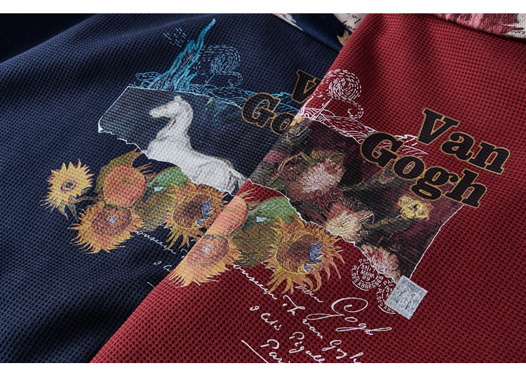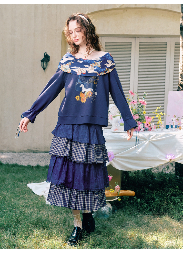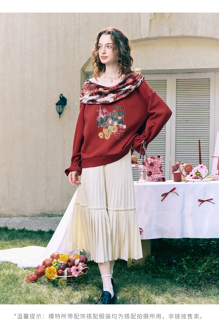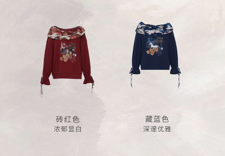 两三事梵高文艺未完日记2026春新款甜美一字肩大翻领印花t恤女