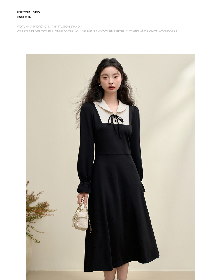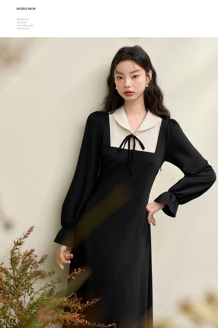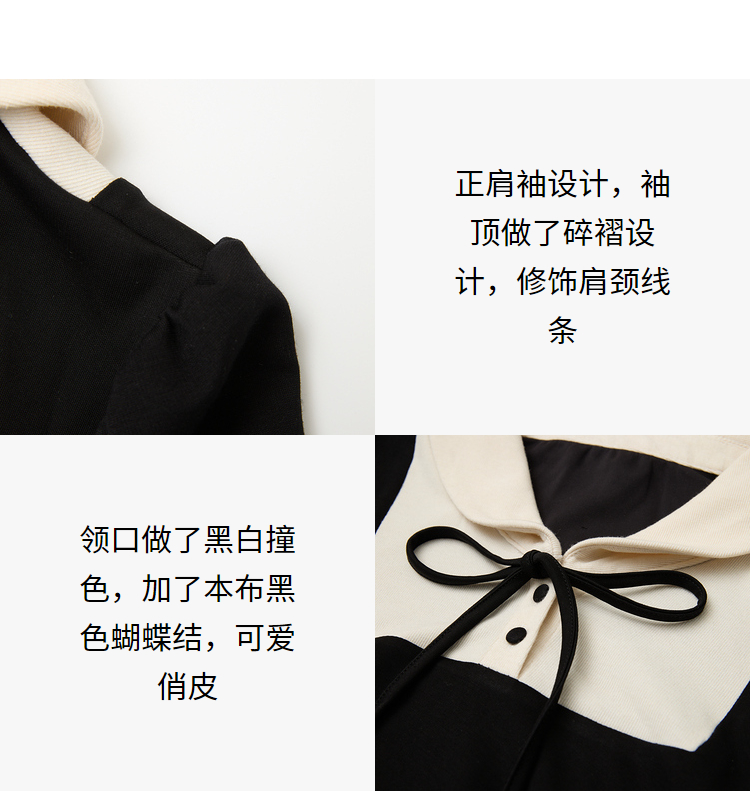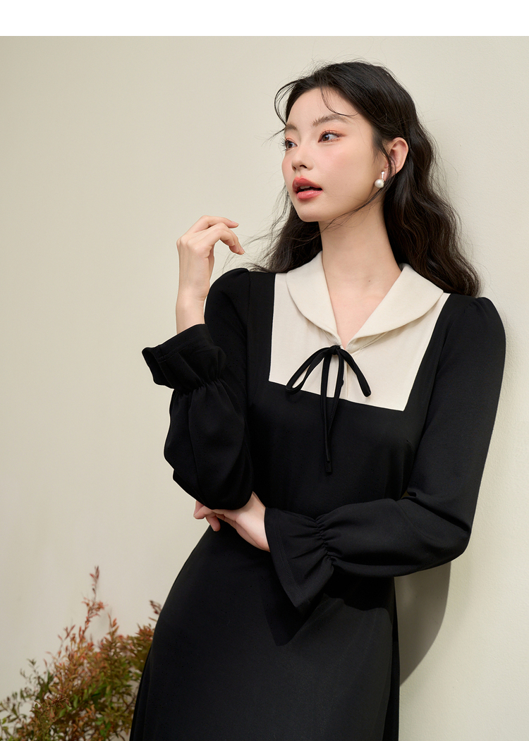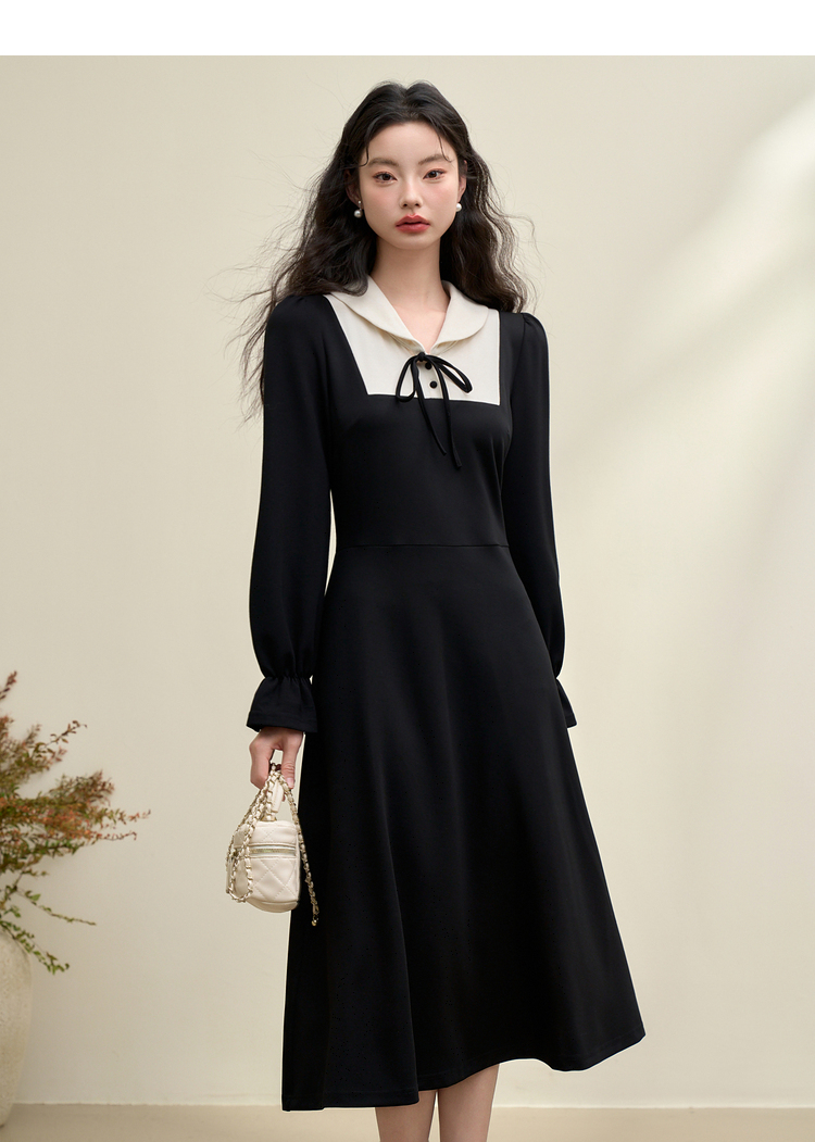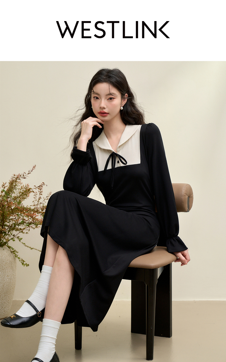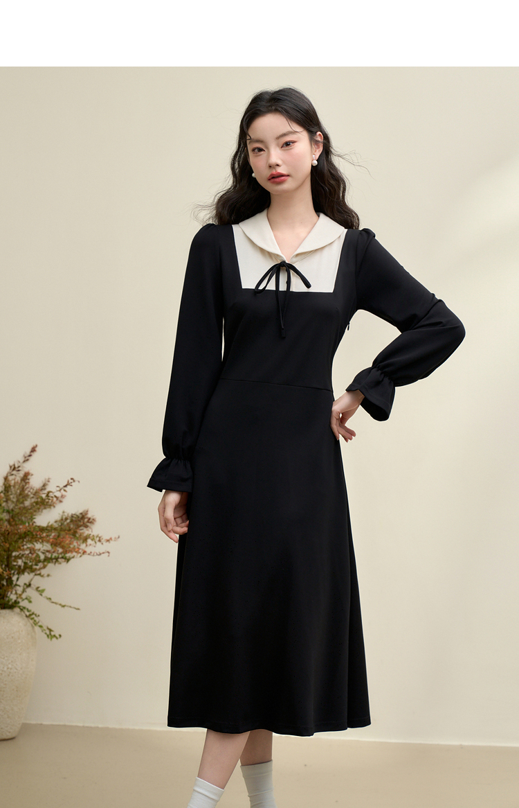 赫本风黑白撞色蝴蝶结长袖连衣裙女秋季收腰V领针织裙V4142952