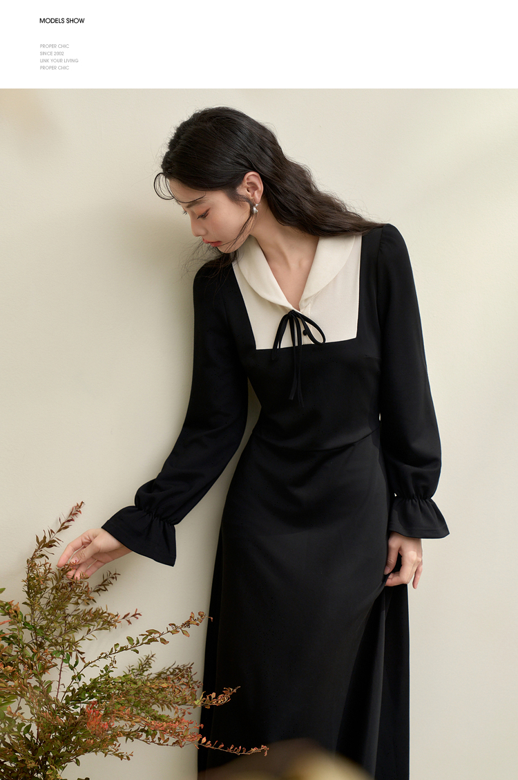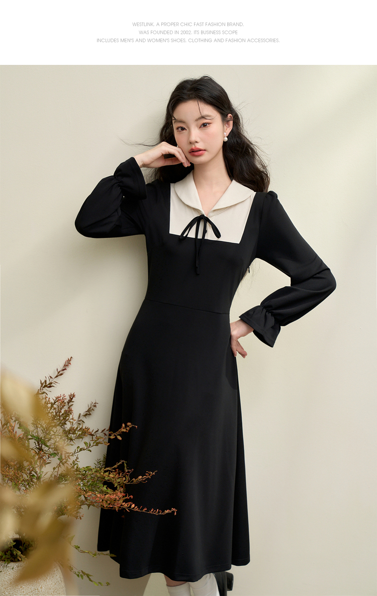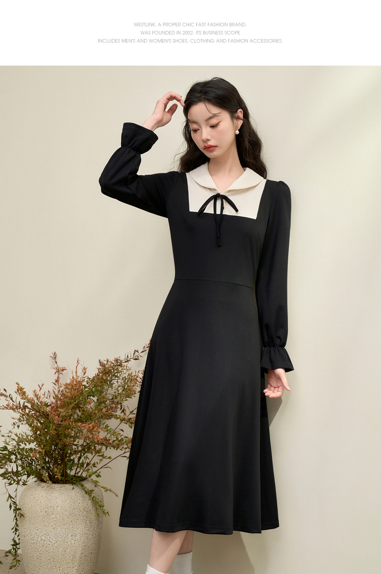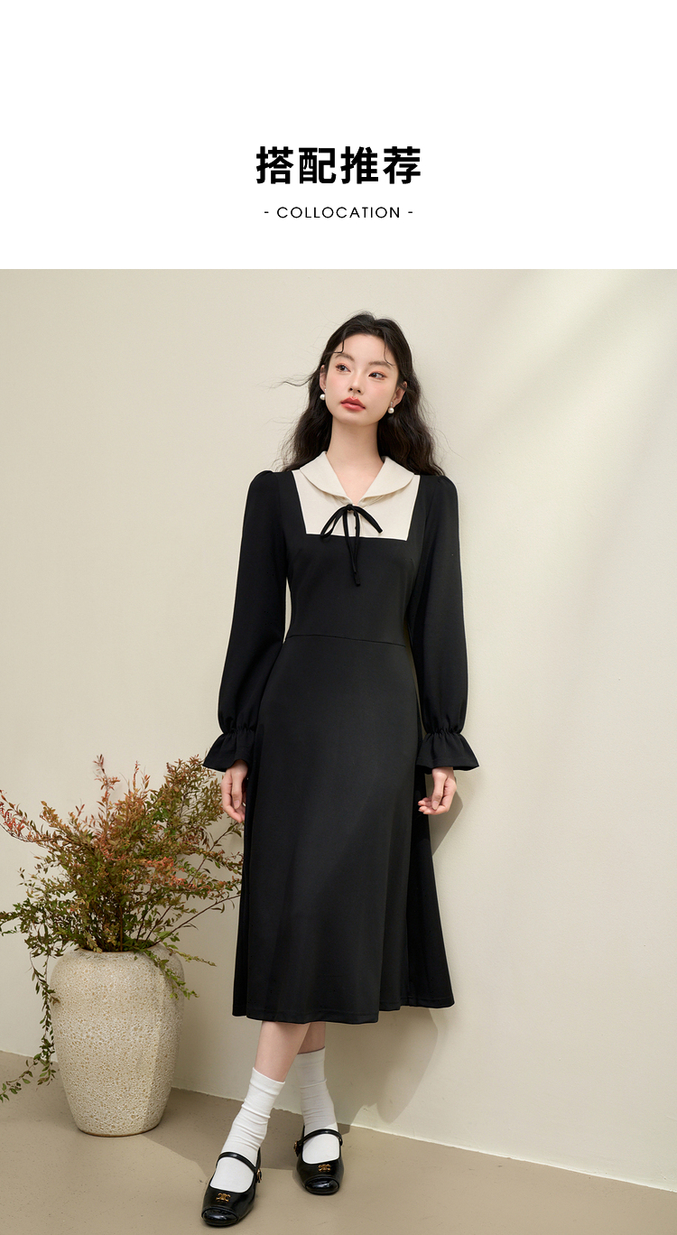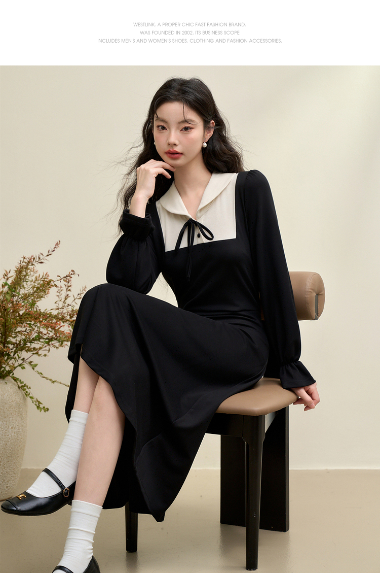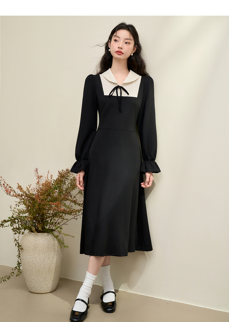 赫本风黑白撞色蝴蝶结长袖连衣裙女秋季收腰V领针织裙V4142952