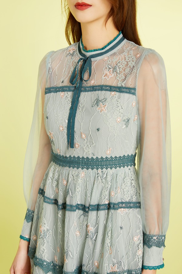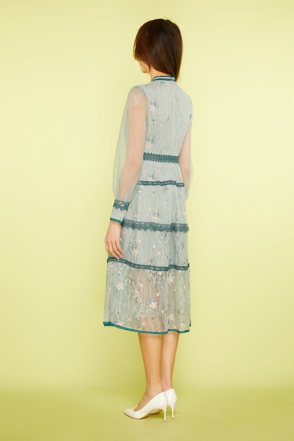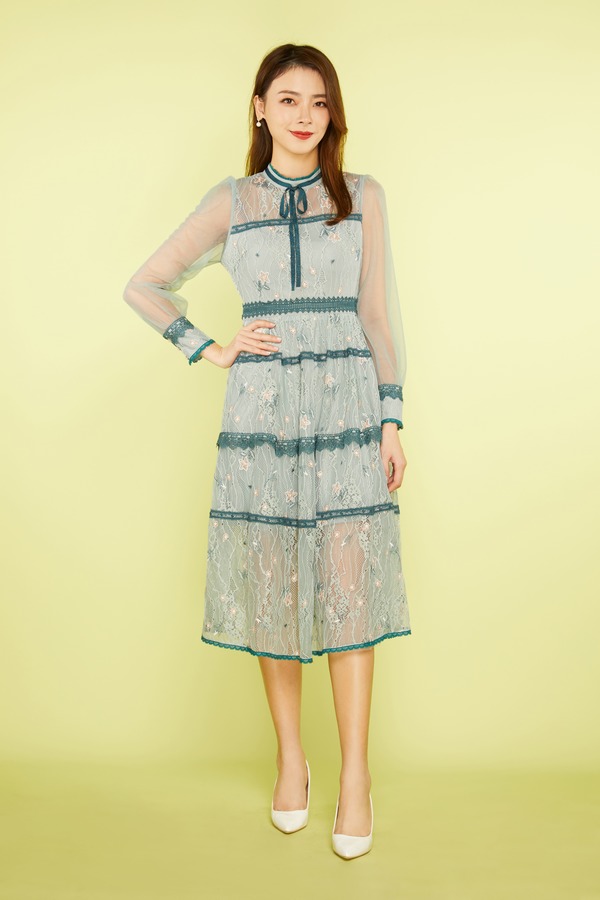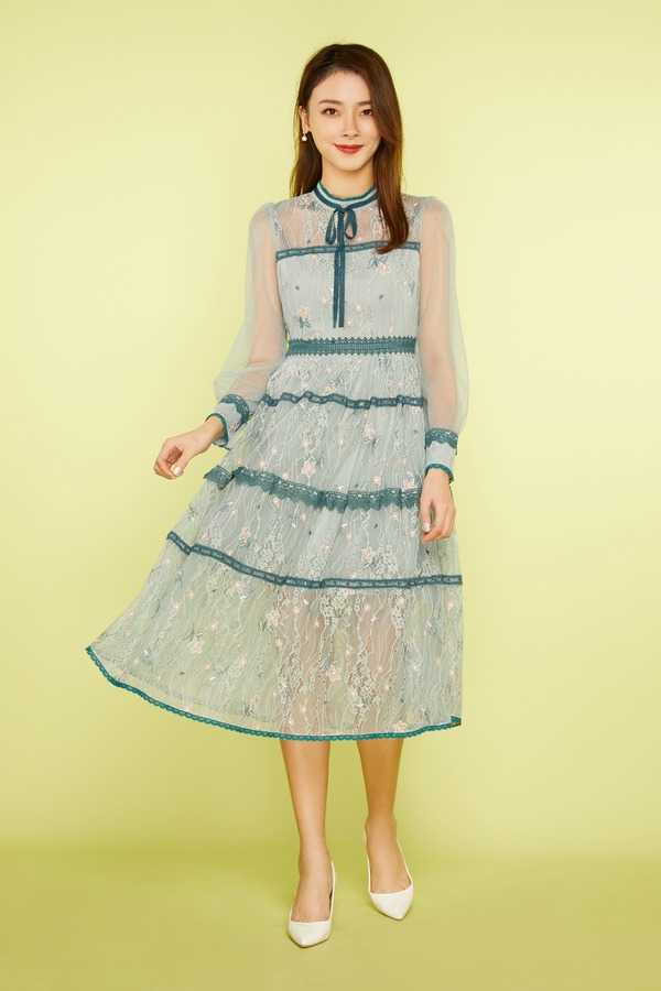ELLA JADE 绿色刺绣蕾丝收腰连衣裙 11269