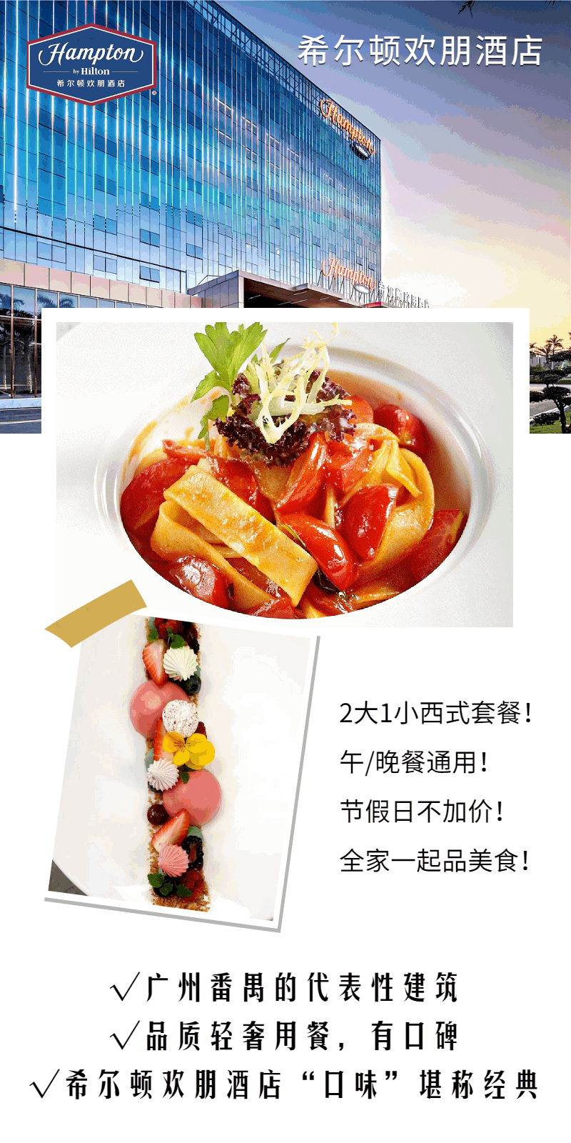 抢购有效期截止 5月30日 【番禺大道丨希尔顿欢朋酒店】午/晚餐通用,节假日不加价!¥168抢2大1小西式套餐!脆皮鸡扒/深海龙利柳+各种美味菜品等你品尝!