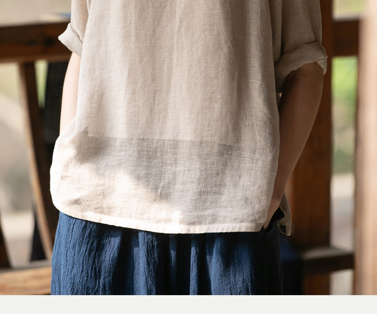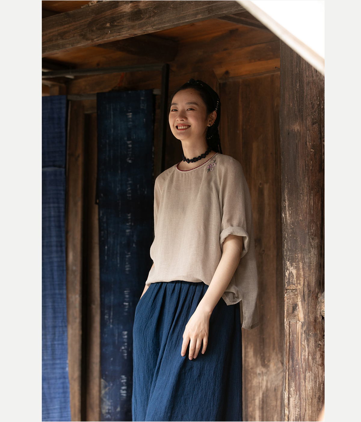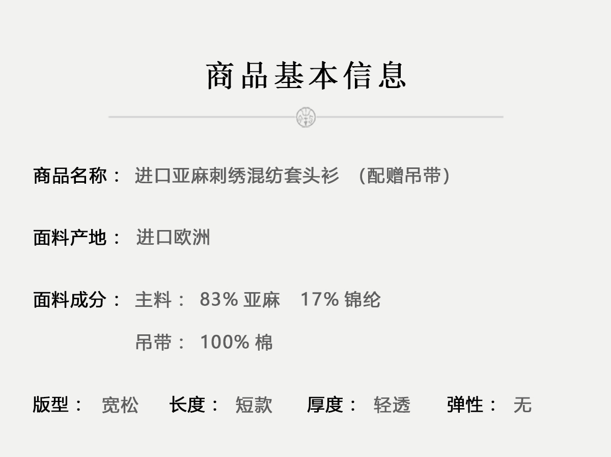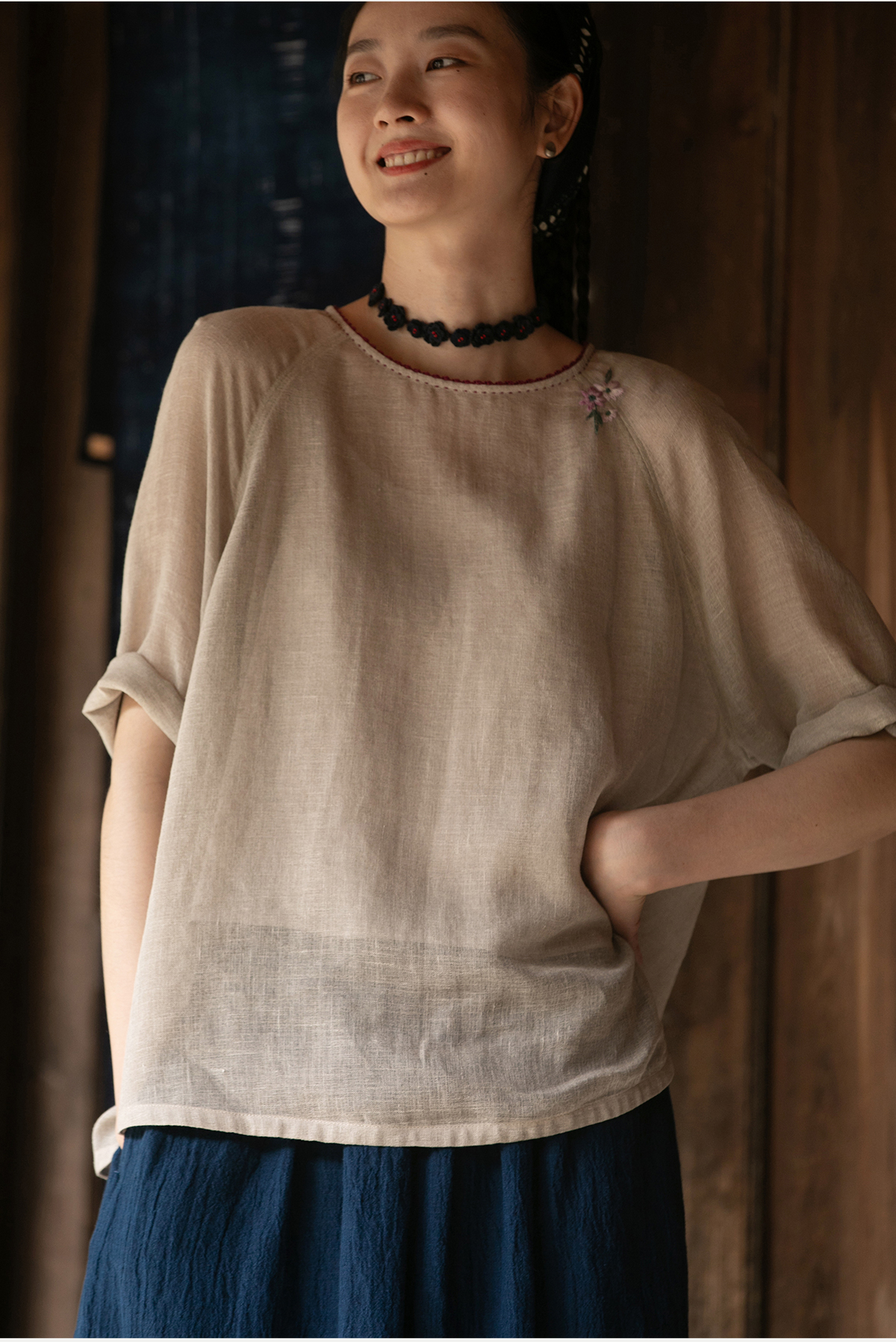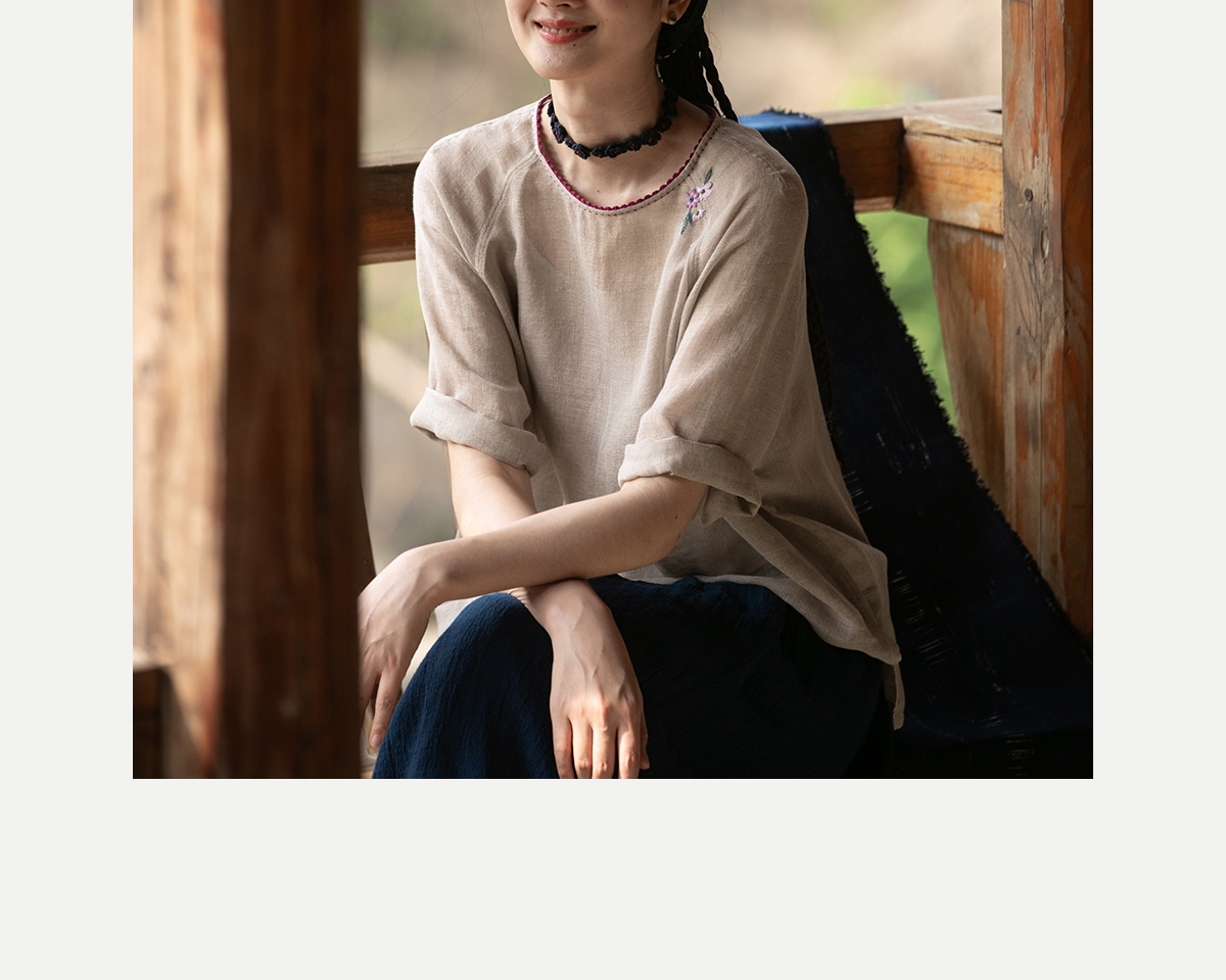 牧衣游原创 进口亚麻刺绣混纺套头衫轻薄柔软质朴圆领上衣 知往