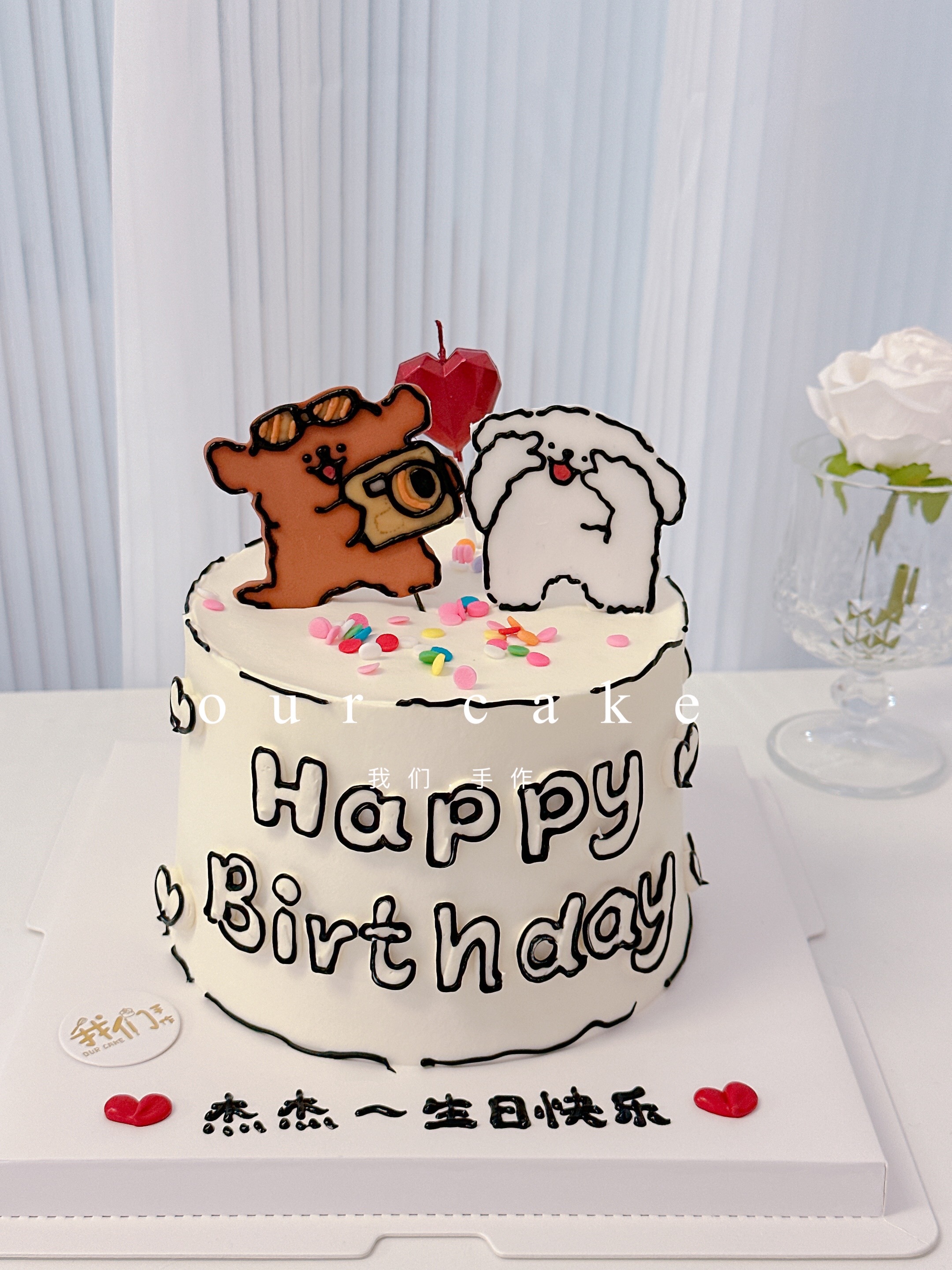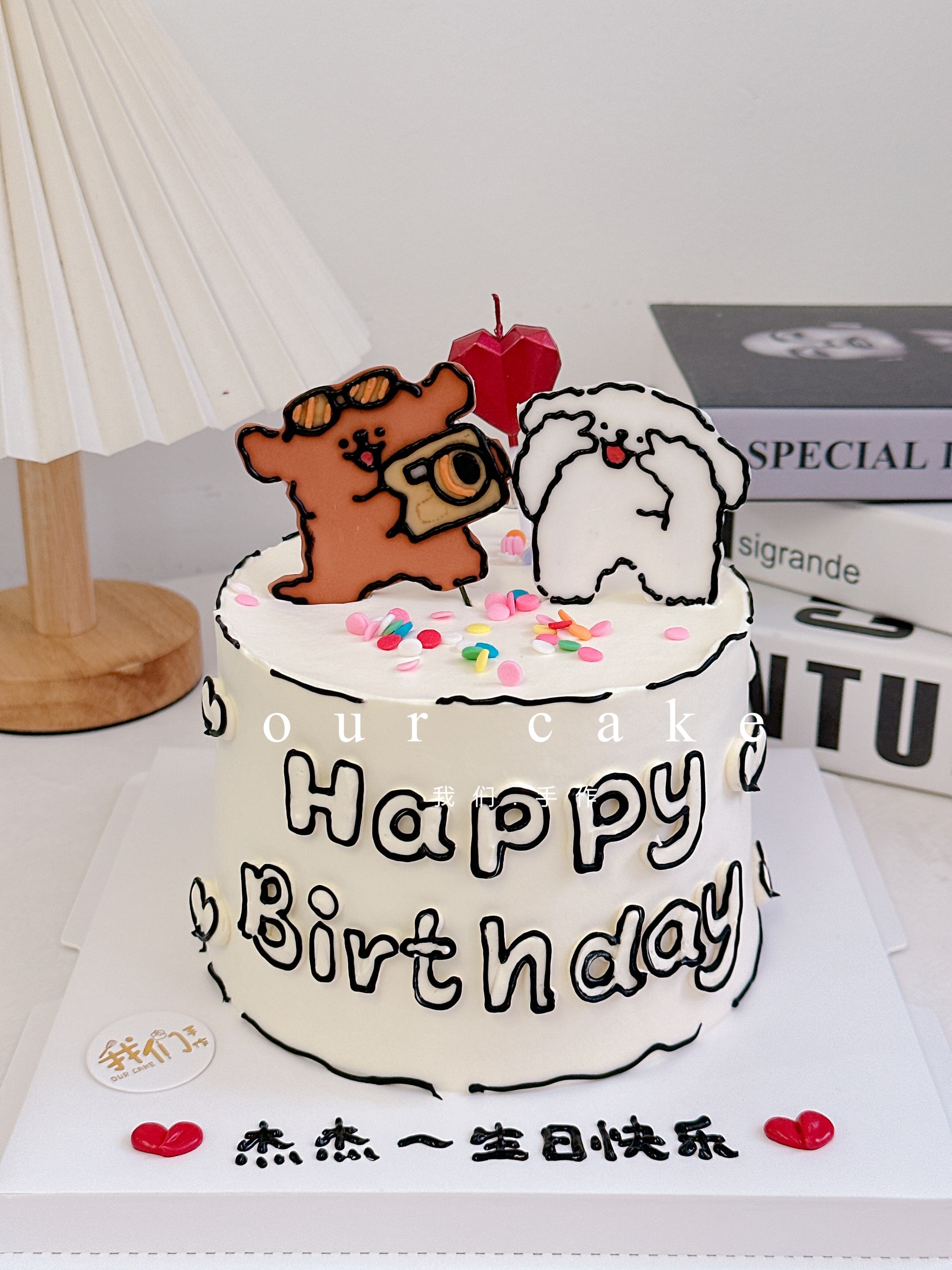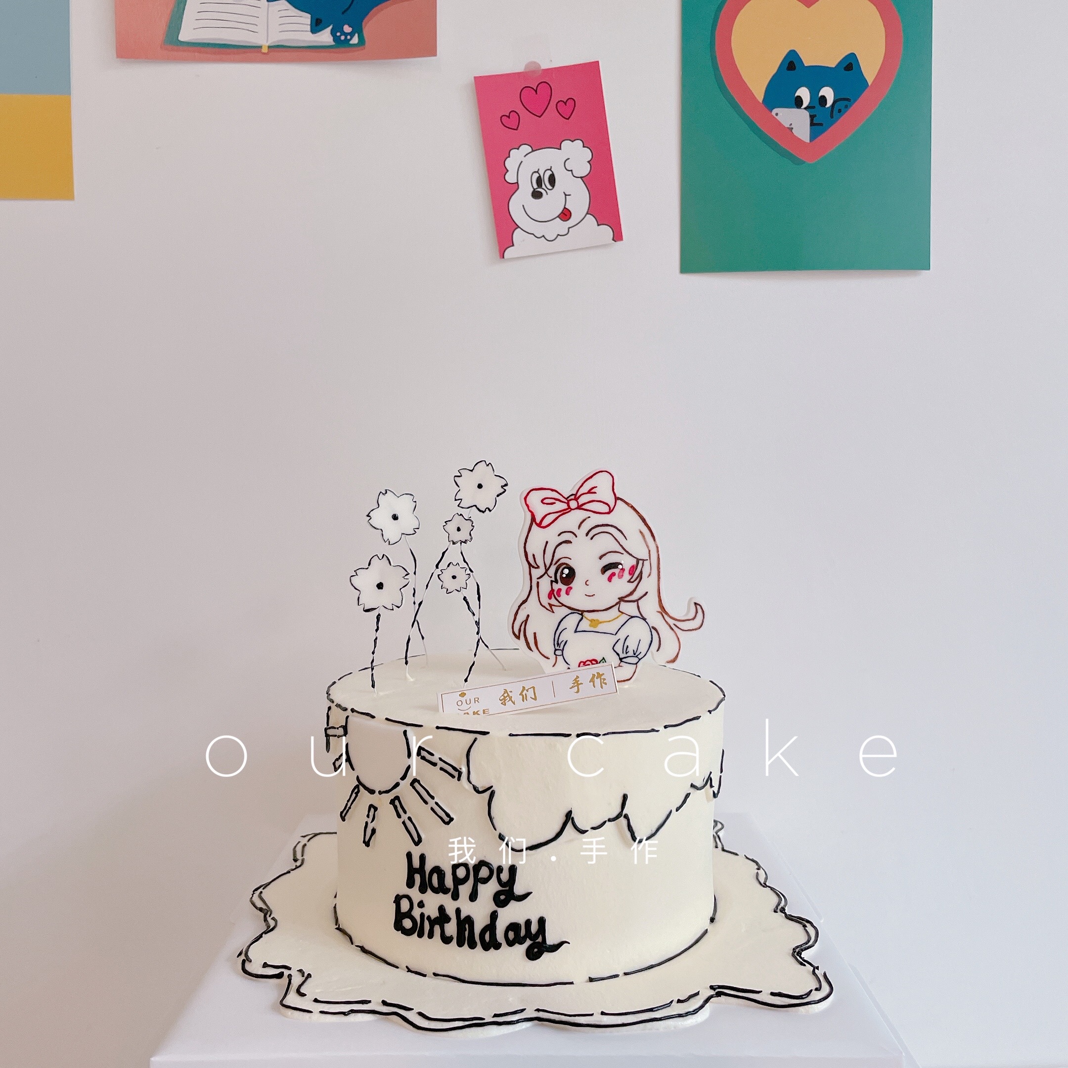 二次元漫画小女孩线条狗款手绘蛋糕 -低糖处理无添加