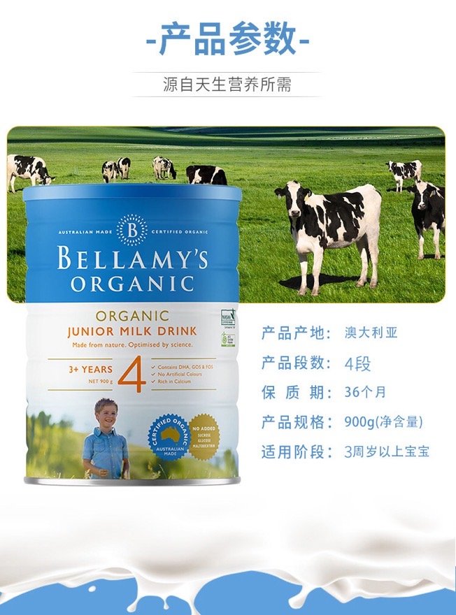 新包装,每罐900g,适合3岁以上宝宝。天然纯正,营养均衡,有机配方,特为刚出生的婴儿生长需要配置必需营养物质,维生素和矿物质。不含转基因原料、抗生素、农药杀虫剂、以及人工合成激素。细心呵护宝宝成长,促进婴儿智力,营养更健康