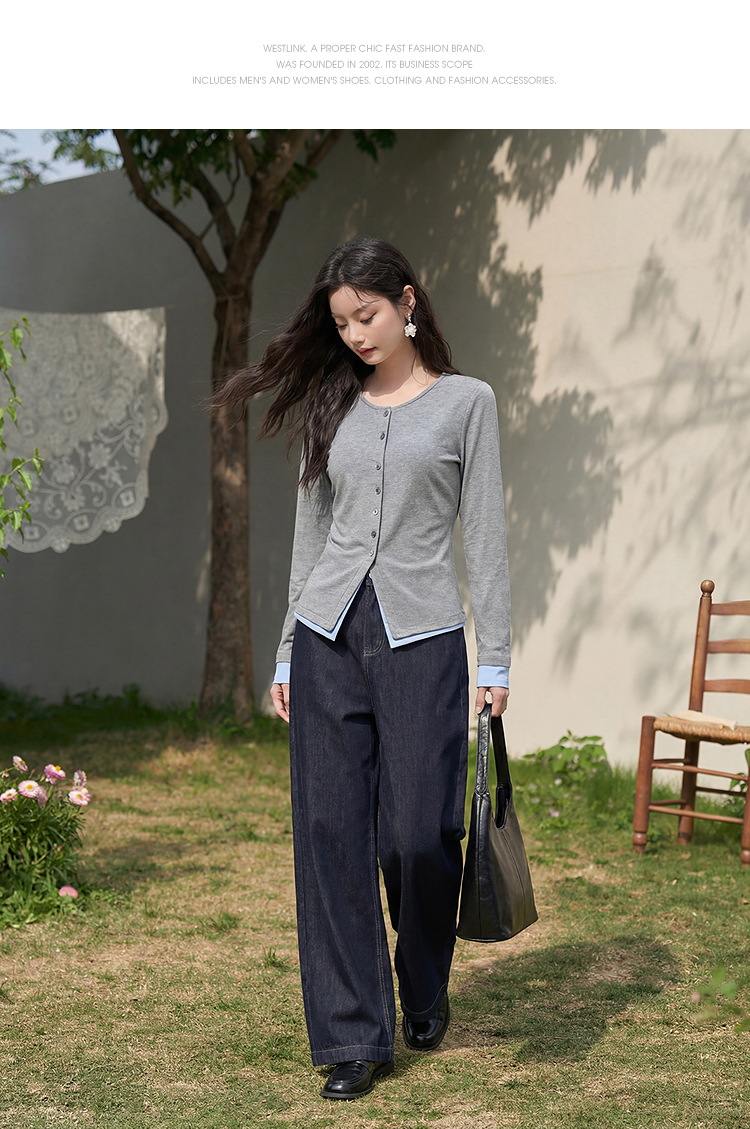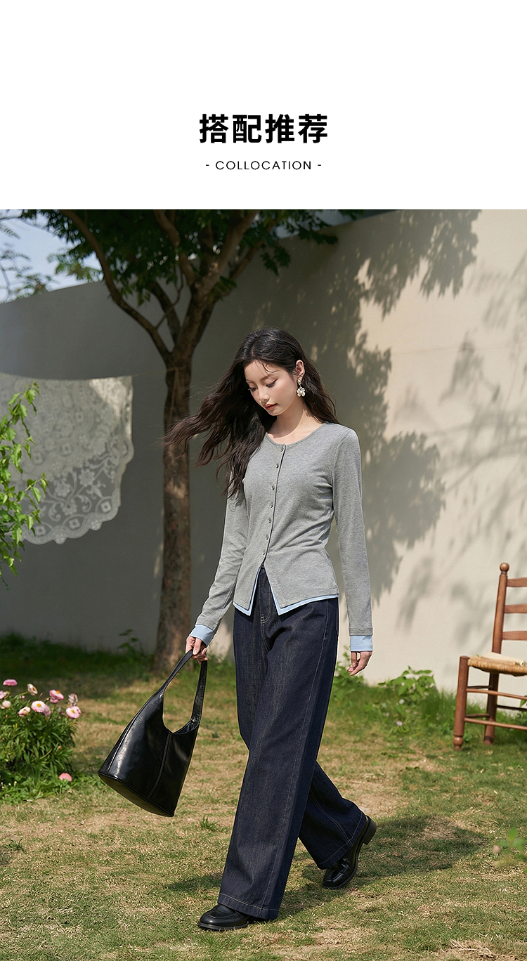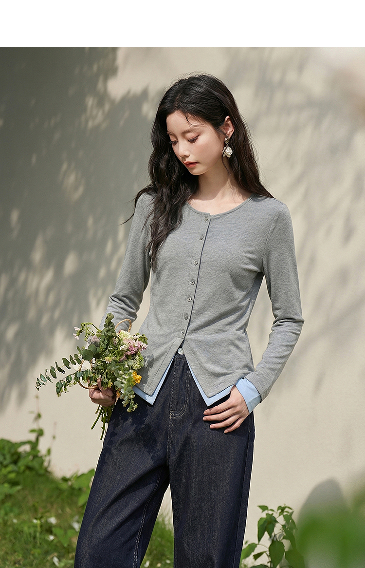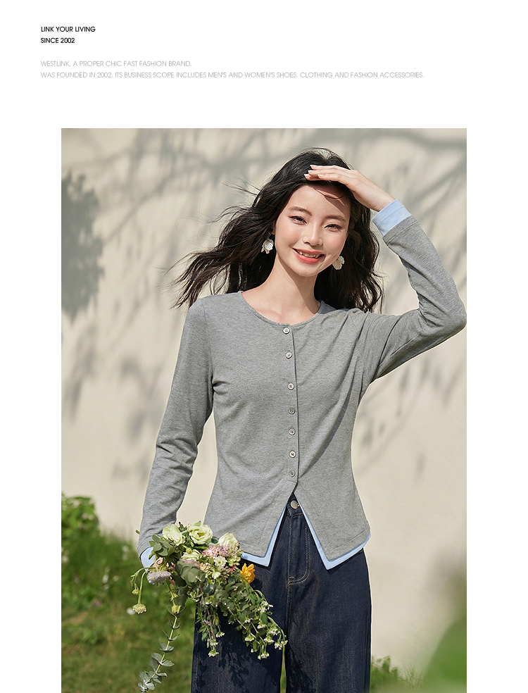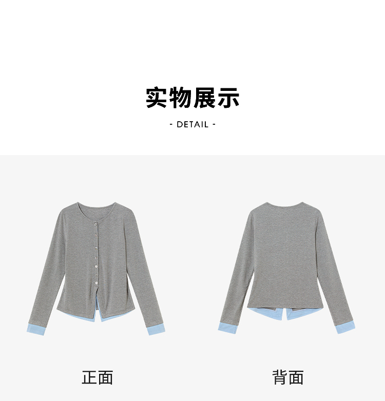 西遇拼接假两件长袖T恤女2026年春季新款修身半开领内搭打底衫10260016