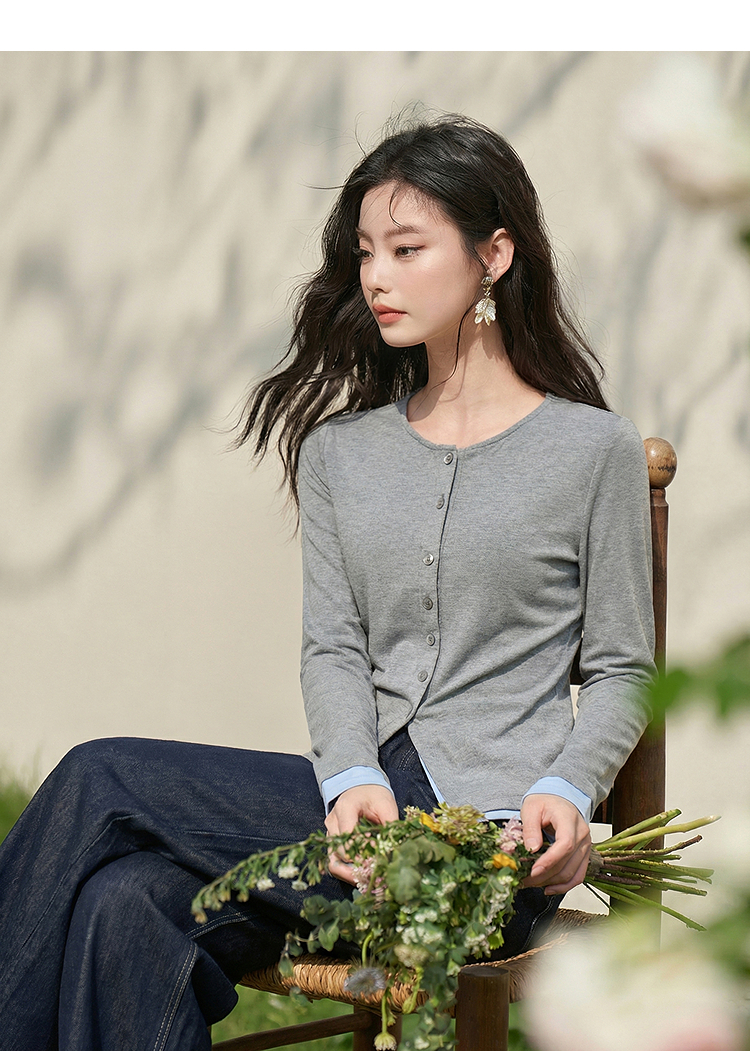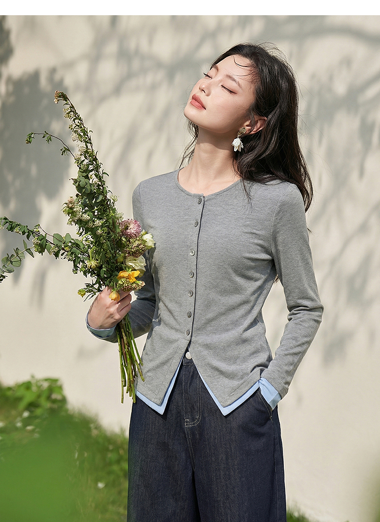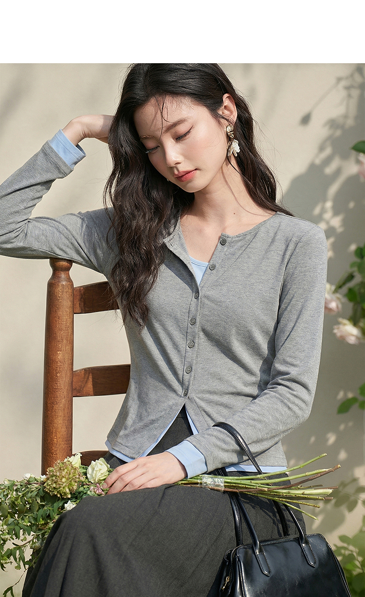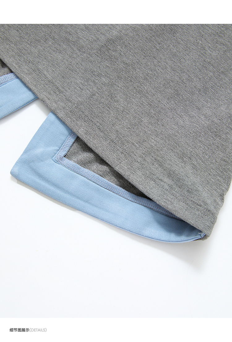 西遇拼接假两件长袖T恤女2026年春季新款修身半开领内搭打底衫10260016