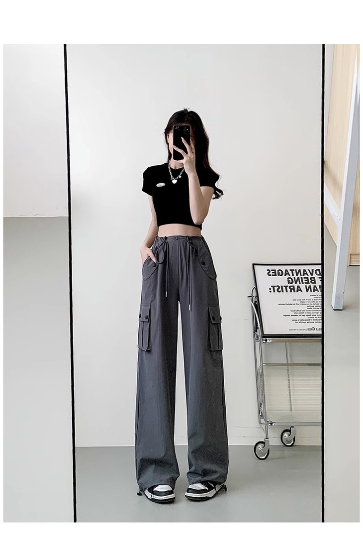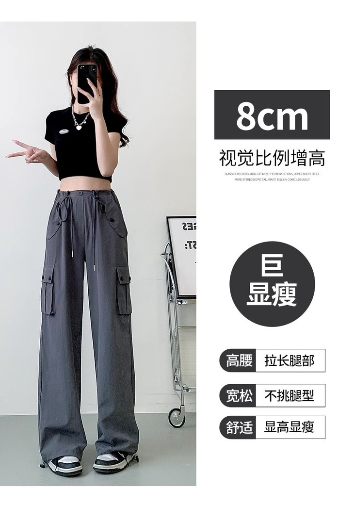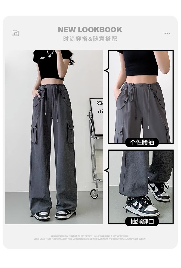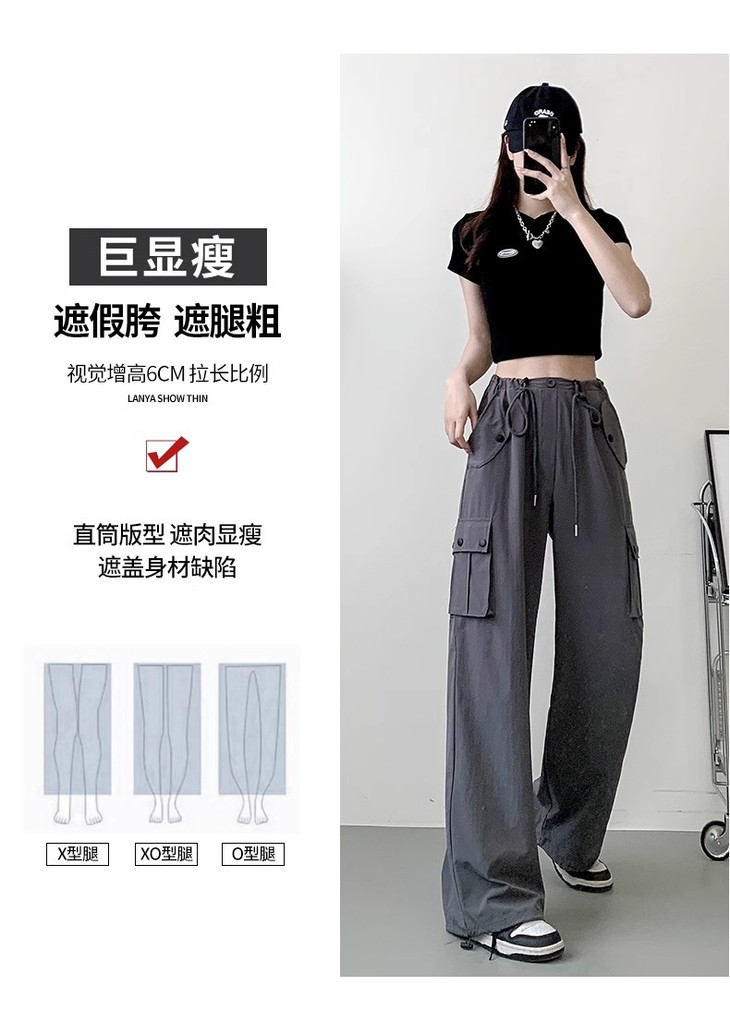 【夏季新款灰色工装裤】女酷飒风宽松直筒美式高腰阔腿速干运动裤