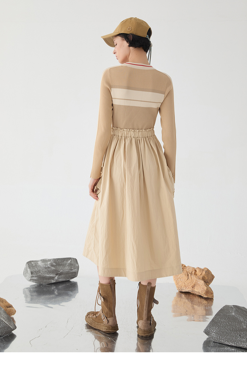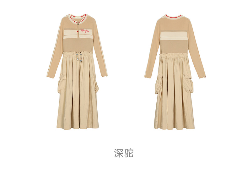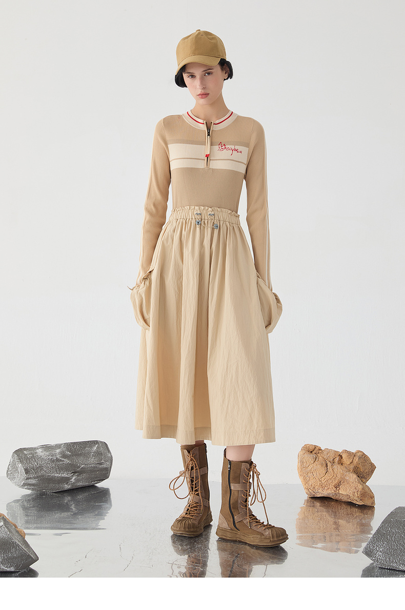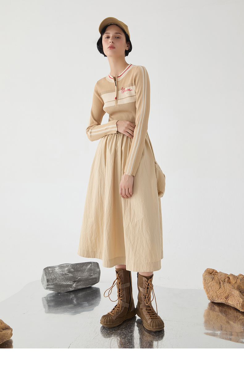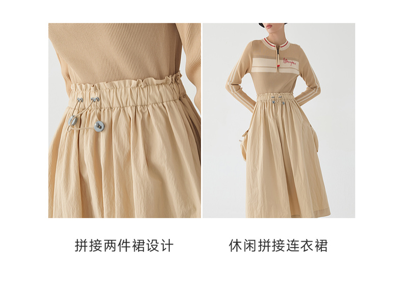 谜底针织拼接连衣裙长袖2025春季新品运动感大摆裙长裙251MZ0399