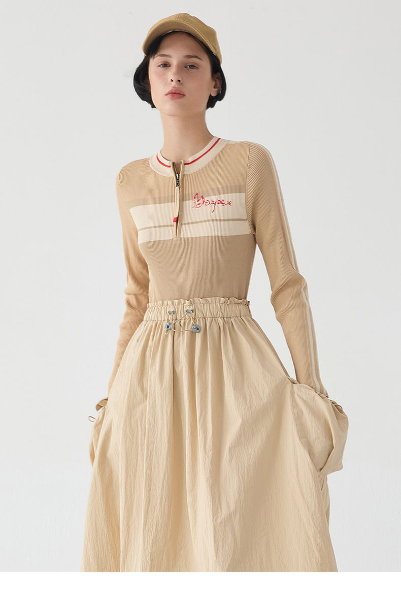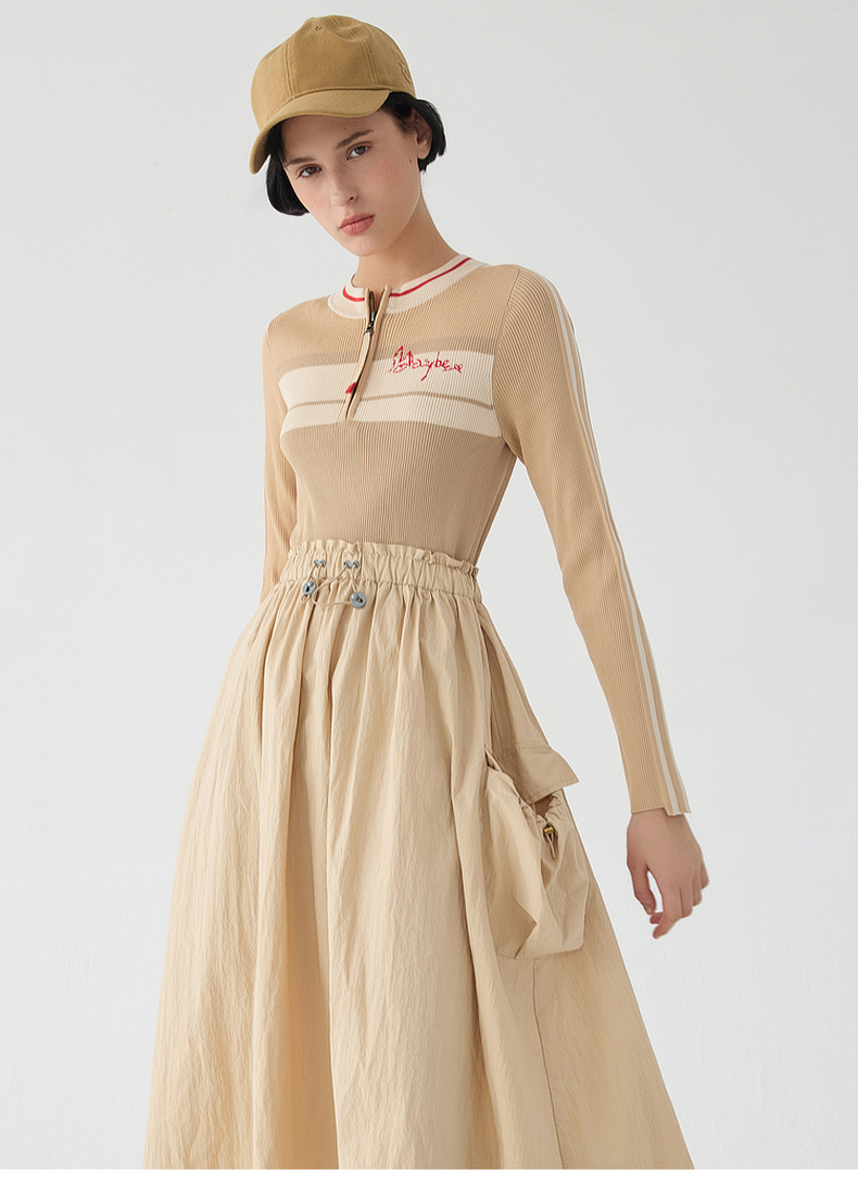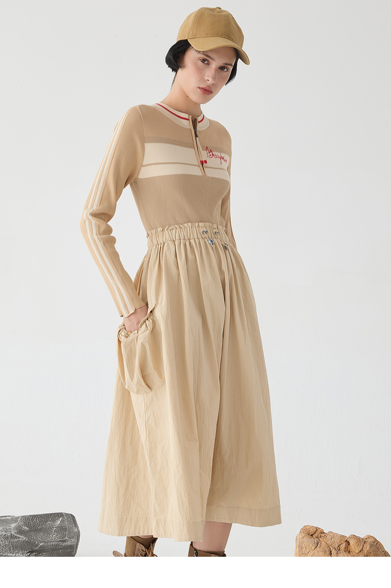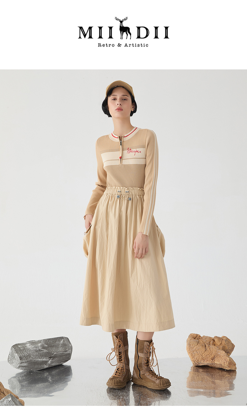 谜底针织拼接连衣裙长袖2025春季新品运动感大摆裙长裙251MZ0399