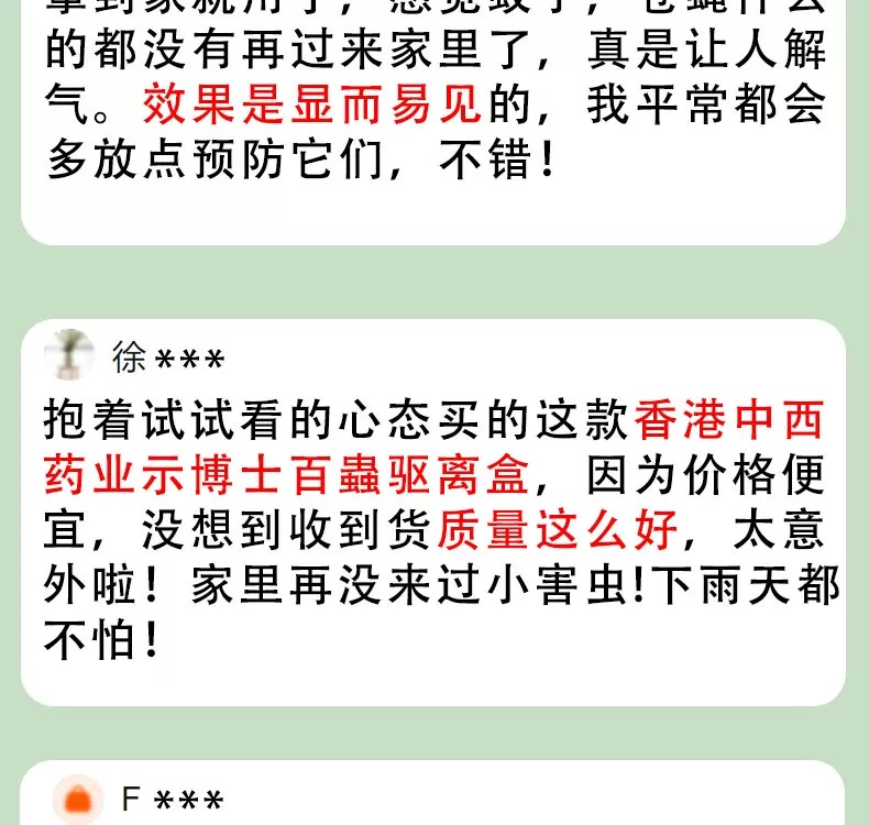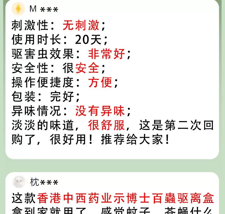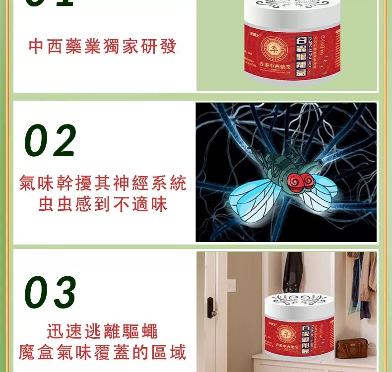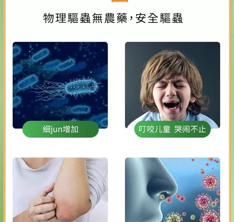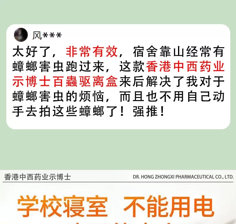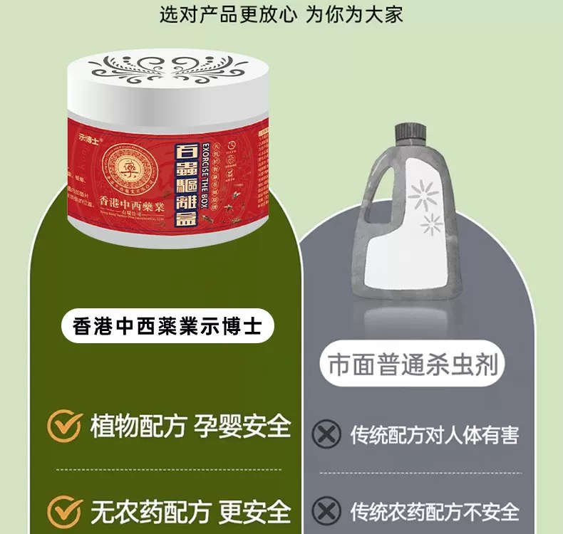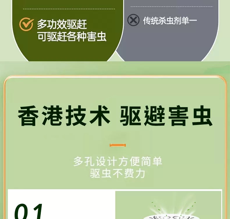 2:此产品是植萃成分,成分温和。含樟樹油、薰衣草精油等,挥发后起到驱离害虫的效果,用的久会发现家里害虫变少甚至消失,但是并不能直接导致害虫身亡,介意请勿拍!