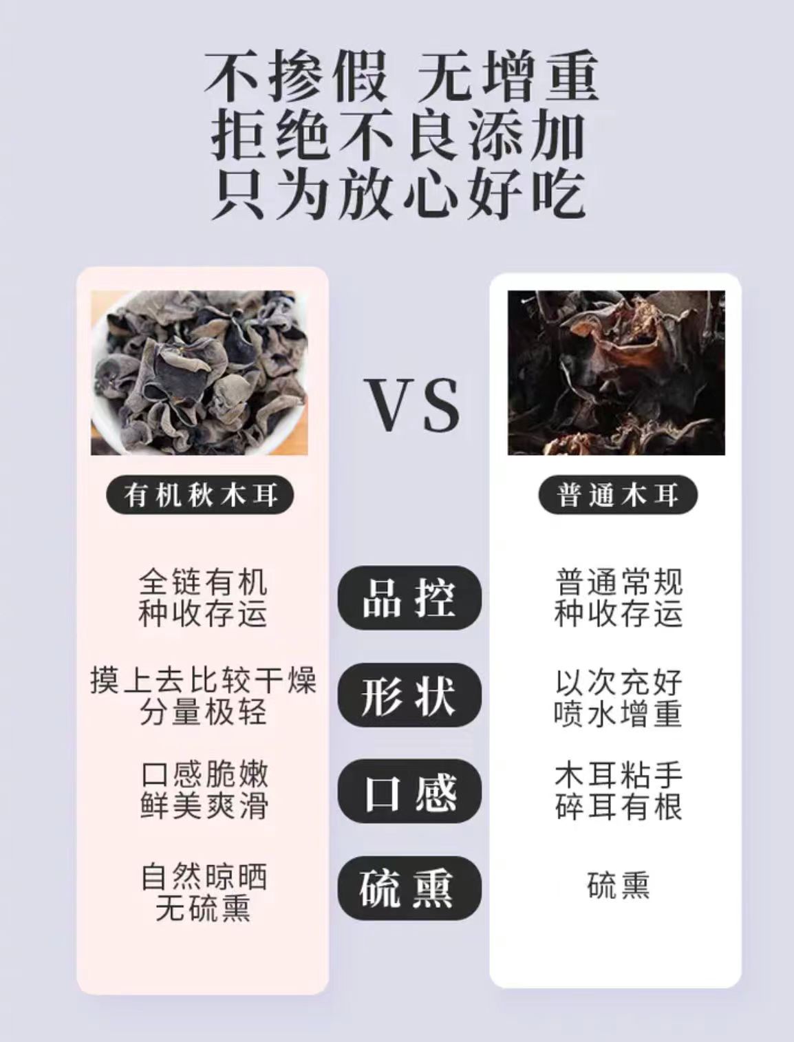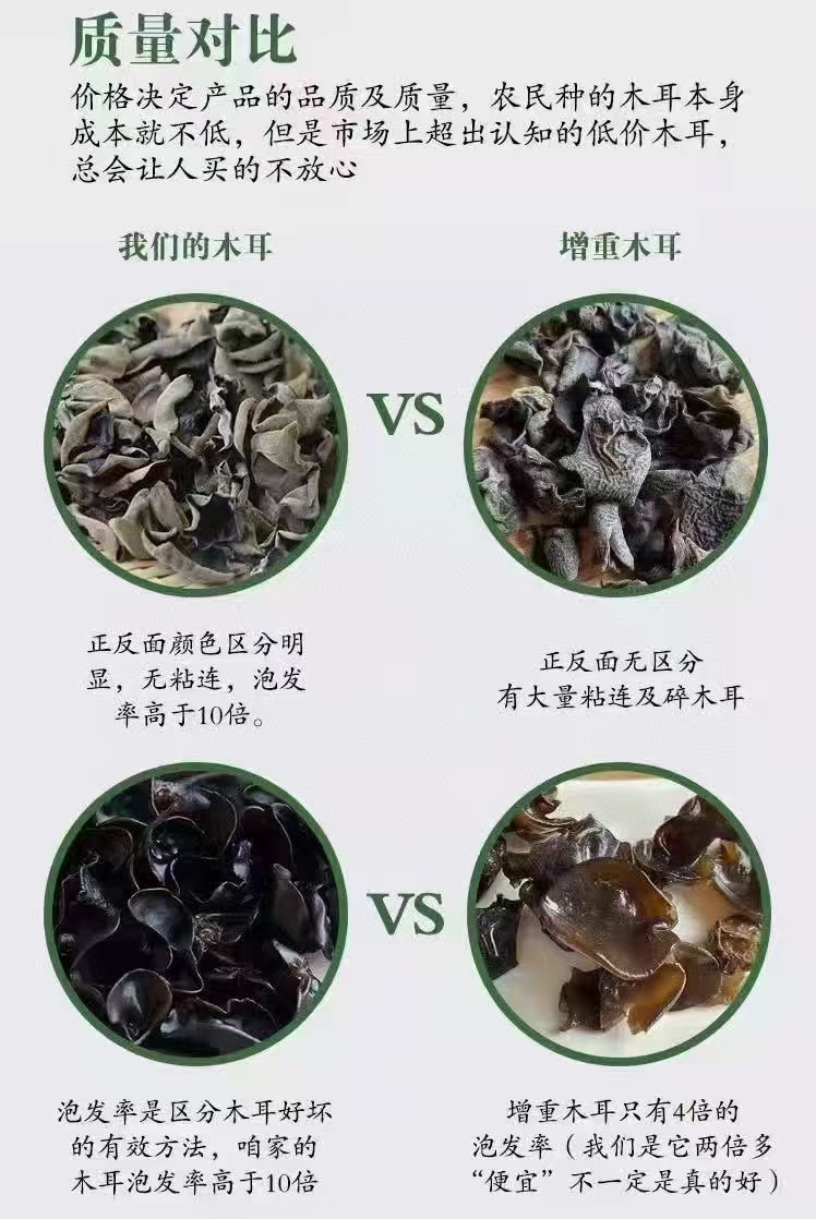 每年春节过后,农户开始着手准备,初春深山里种植,自然生长,阳光雨露滋润,环境好,没有工业污染,初春早晚温差大,黑木耳肉厚,口感脆又劲道依当地山泉水滋养,木耳肉厚柔软,胶质丰富,口感弹爽,5月中下6月初开始采摘采摘的时候没有任何病虫害,是最干净的