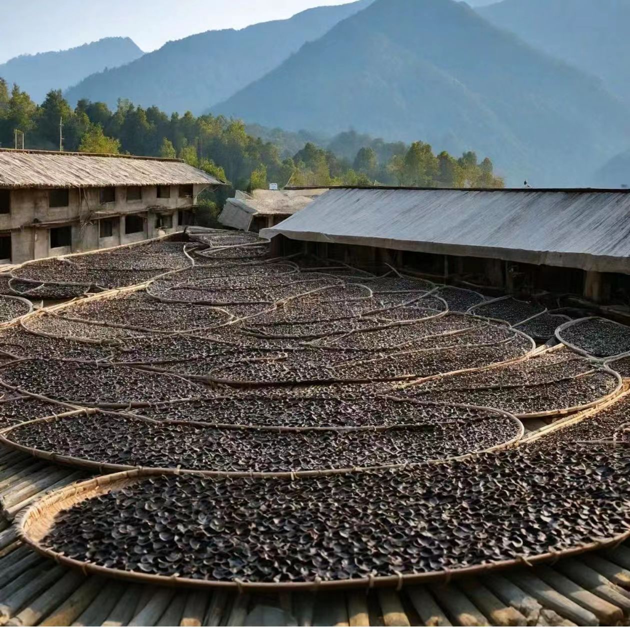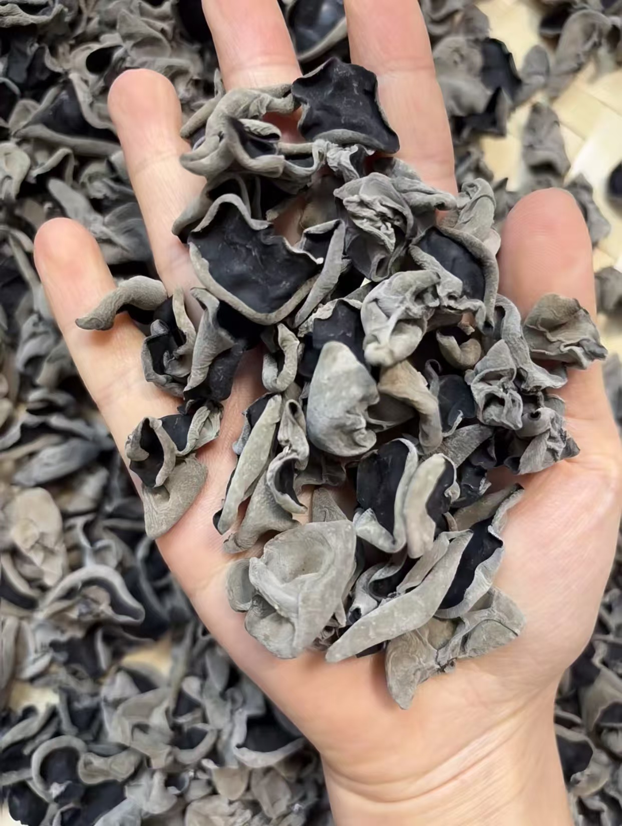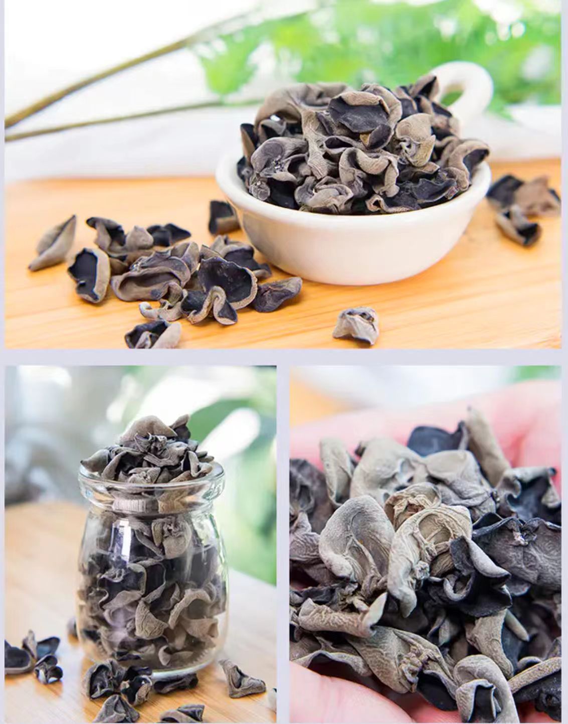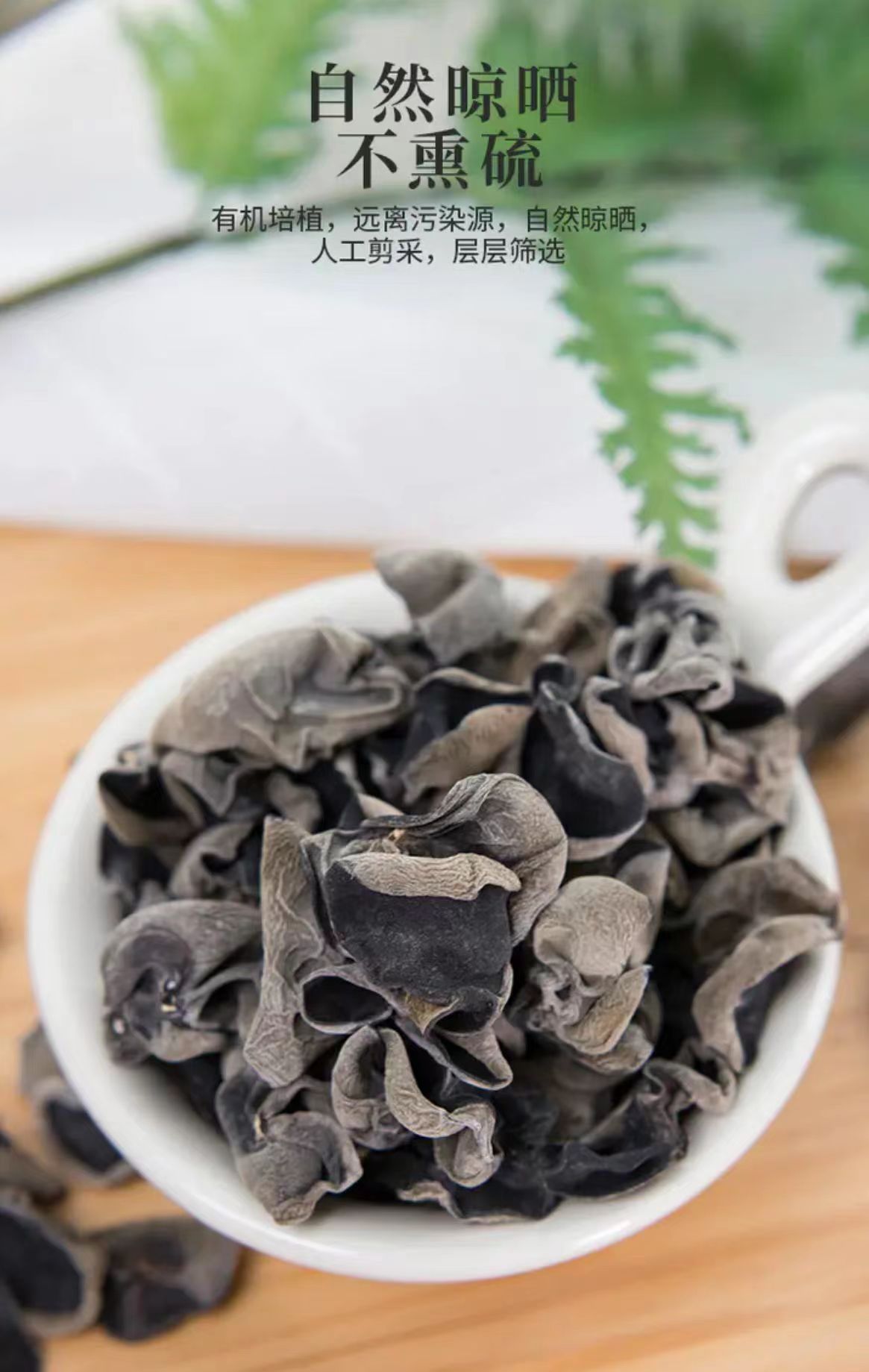 新鲜采摘的木耳,需经过3天以上的自然晾晒,直至完全晾干,木耳纹理清晰,自然卷曲,正反面颜色鲜明的哟。
