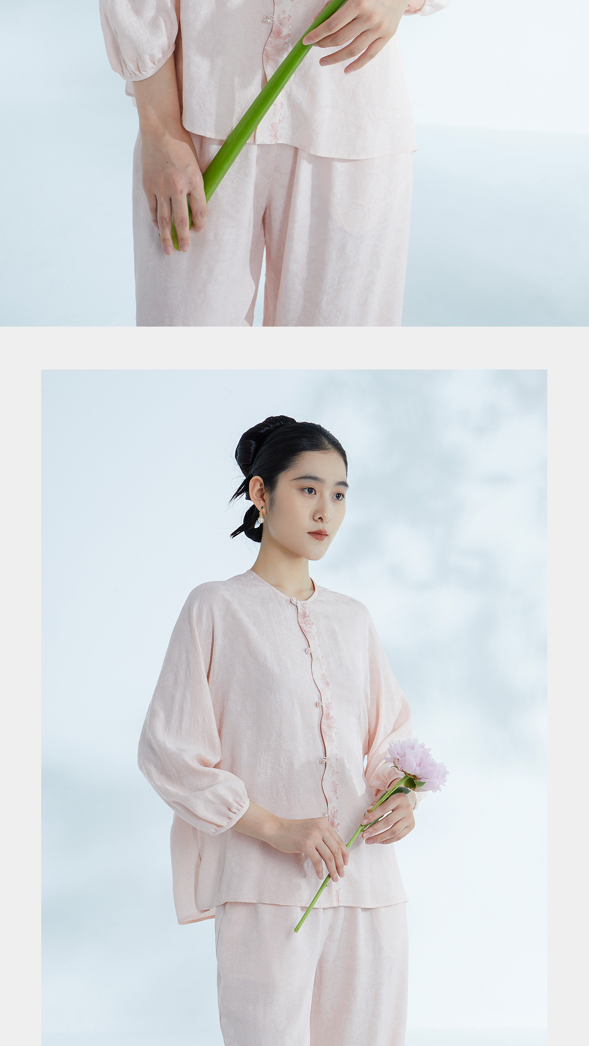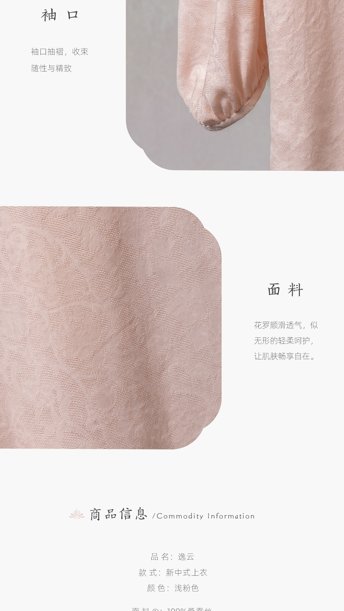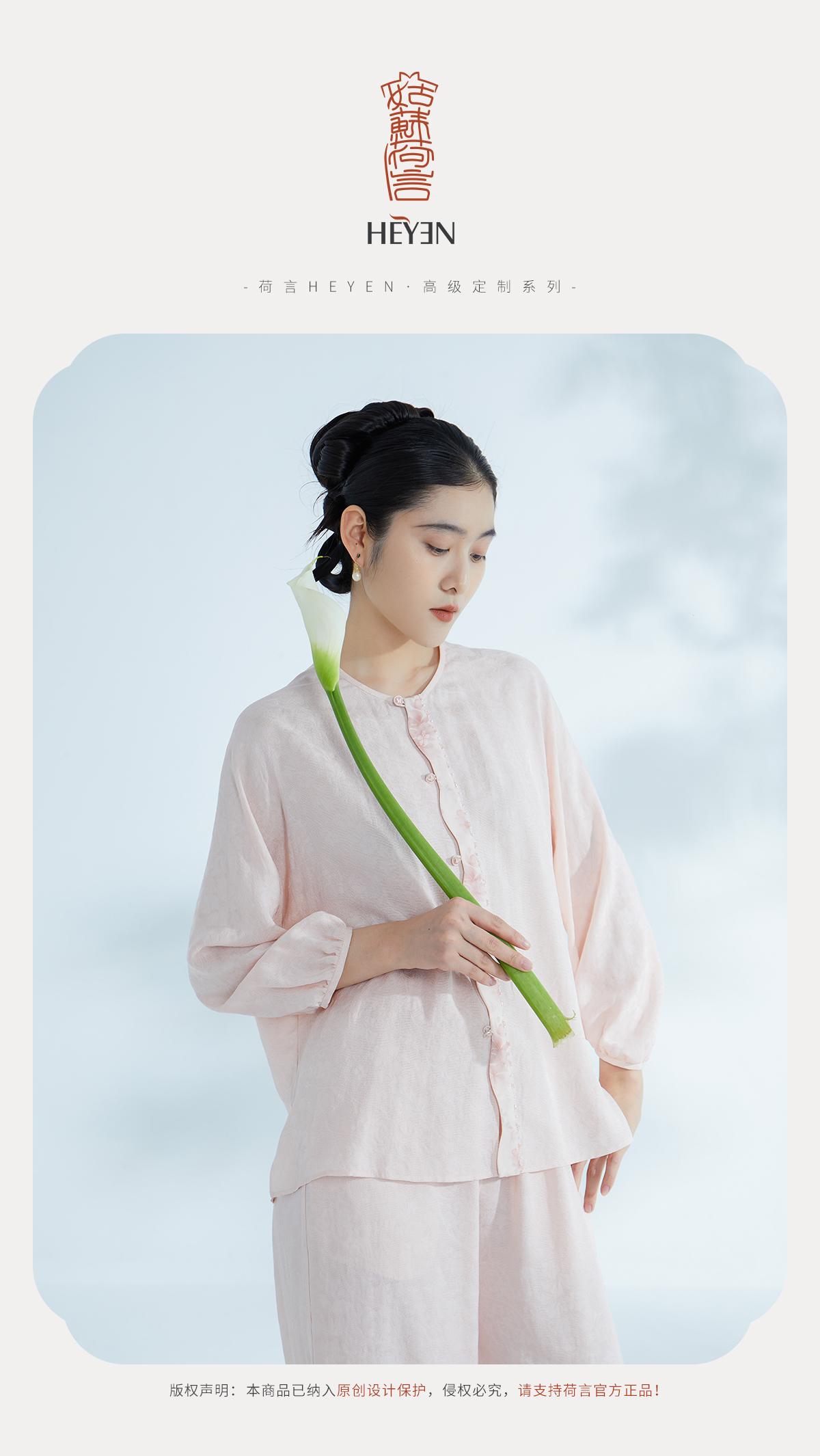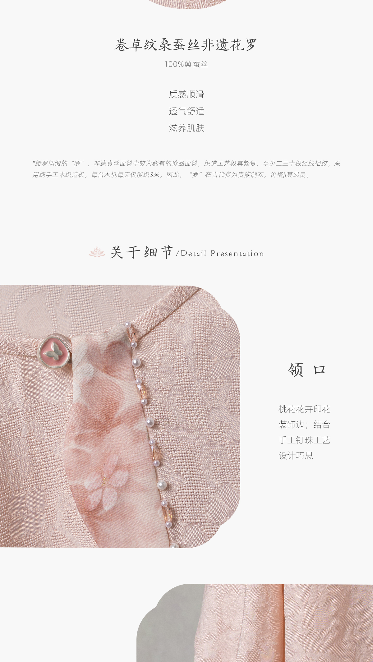 荷言HEYEN 逸云 卷草纹桑蚕丝非遗花罗圆领上衣桃花印花装饰边高级定制