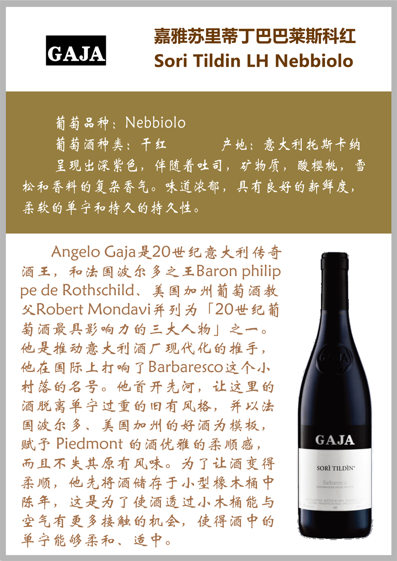 意大利名庄Gaja嘉雅酒庄苏里蒂丁园巴巴莱斯科红葡萄酒