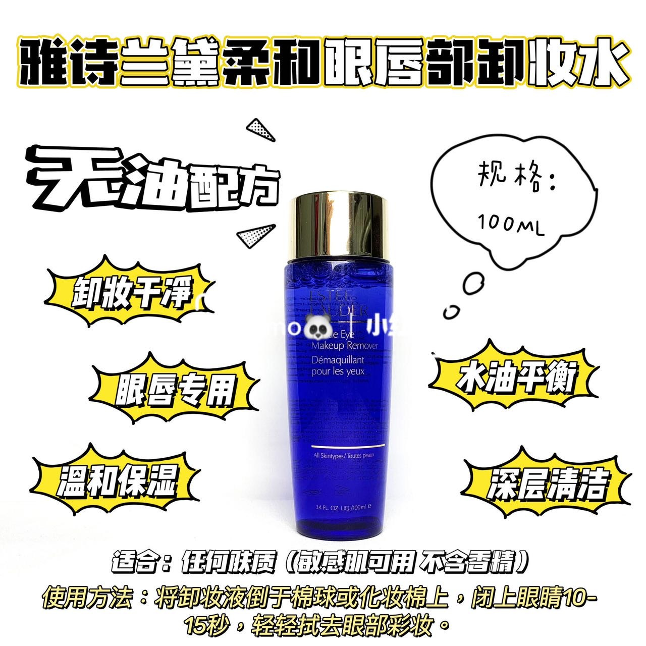 它的质地轻盈,能够迅速彻底地抹去水溶性的眼部彩妆,并不留下任何油脂残留。不含油脂,不含香精香料,经皮肤科专家测试!