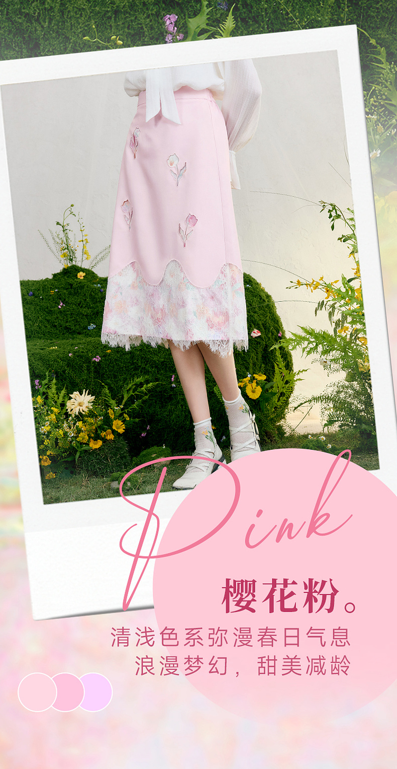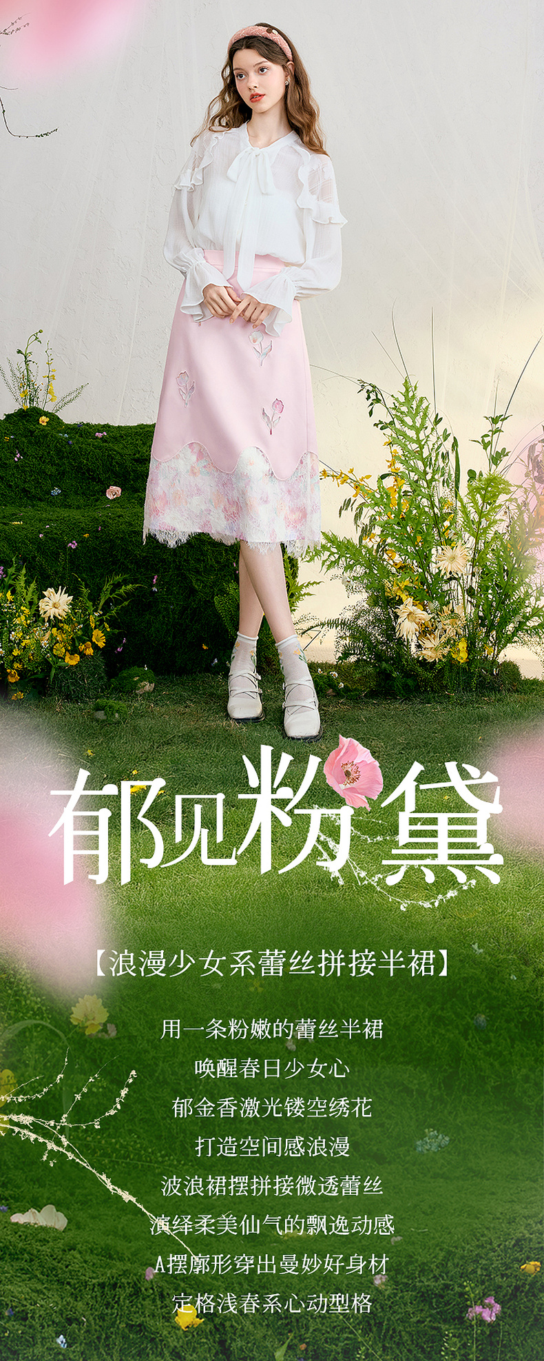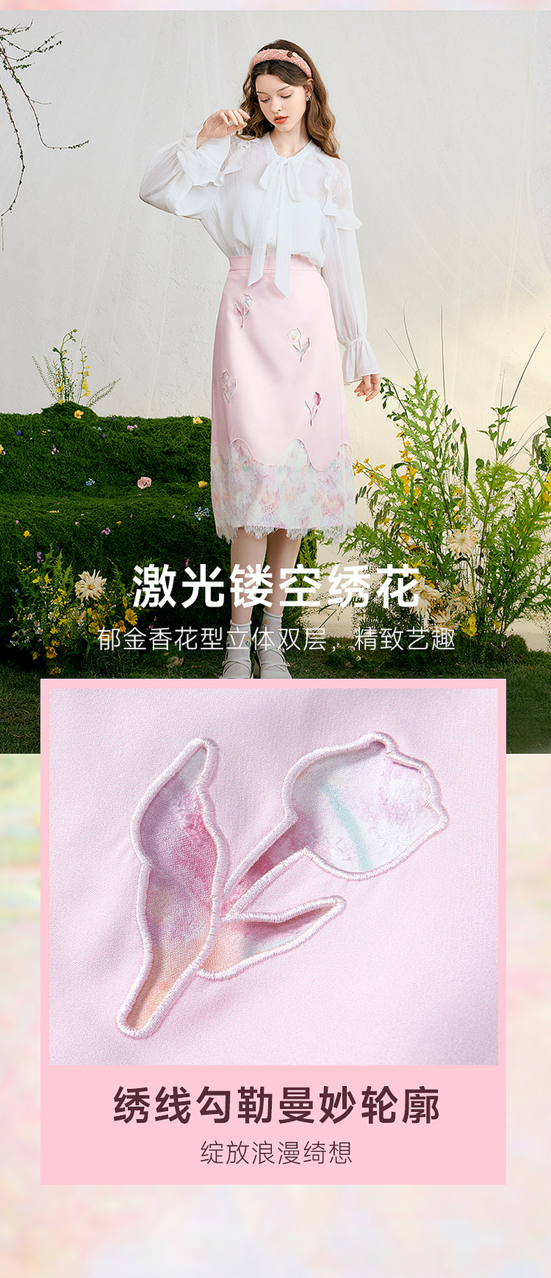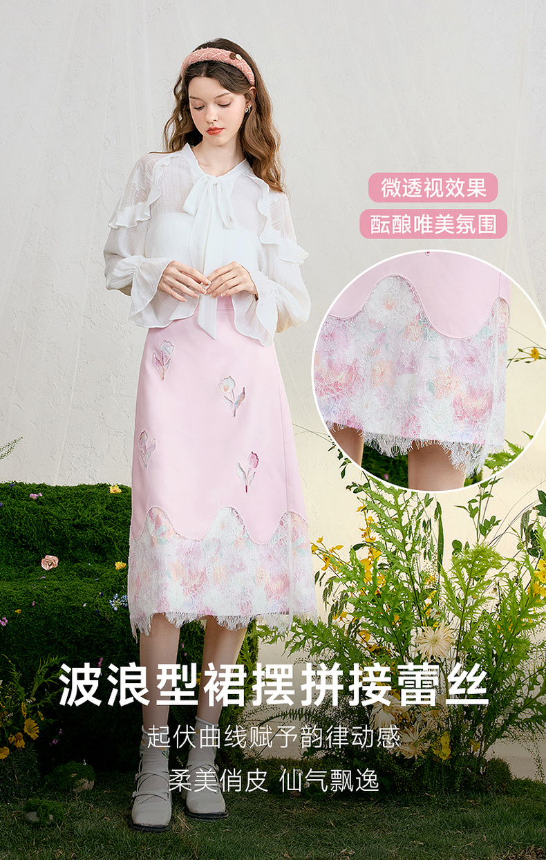 两三事 郁见粉黛 2025春季新款甜美镂空郁金香拼接印花蕾丝半身裙S25CKB290