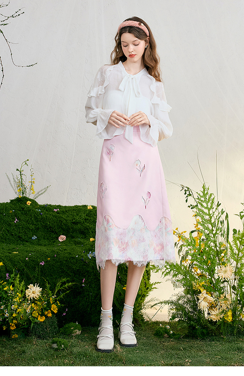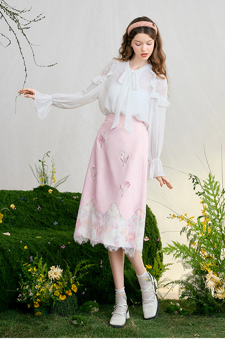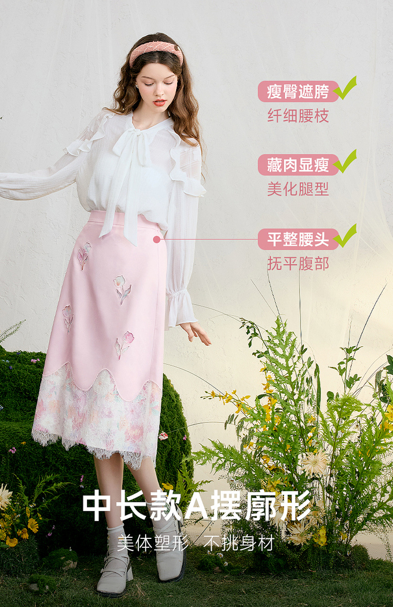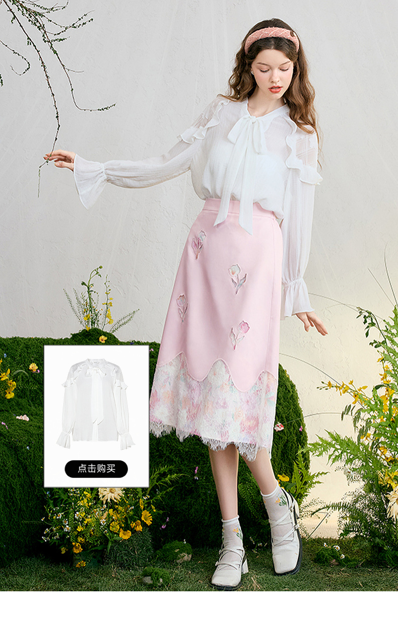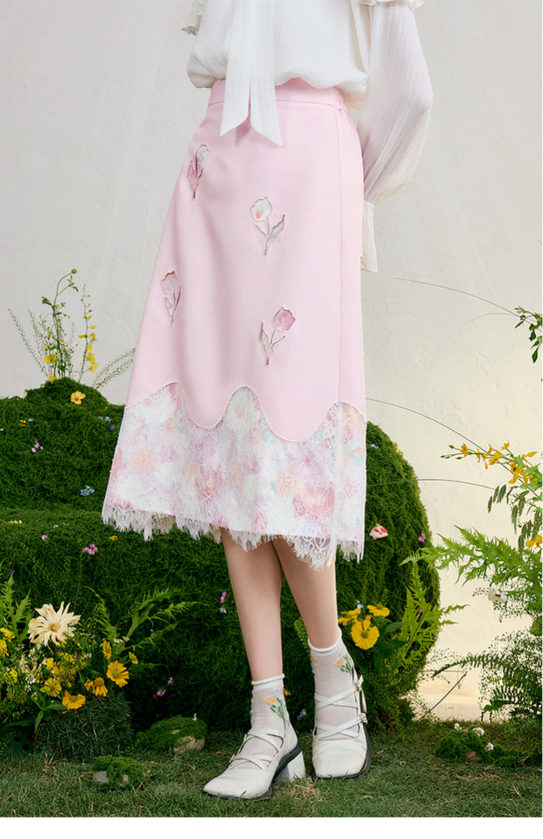 两三事 郁见粉黛 2025春季新款甜美镂空郁金香拼接印花蕾丝半身裙S25CKB290