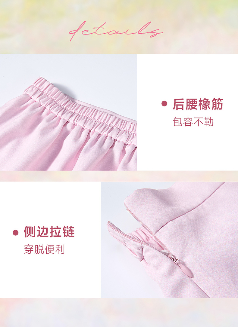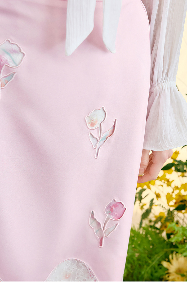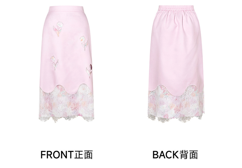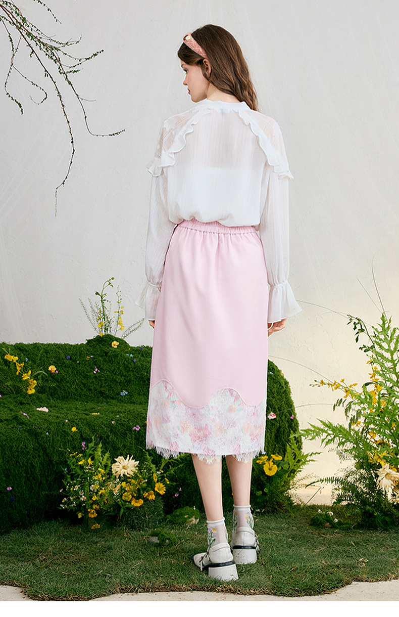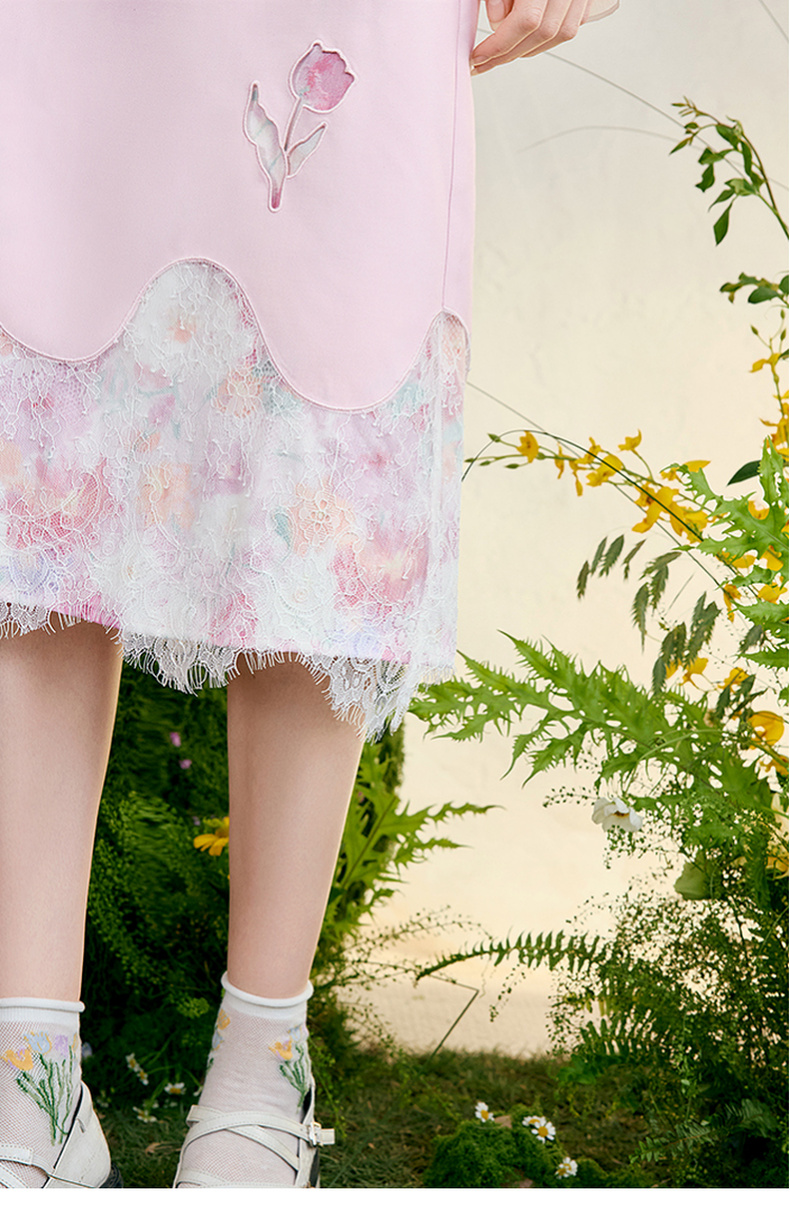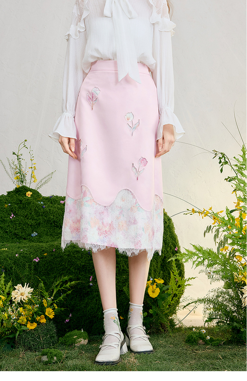 两三事 郁见粉黛 2025春季新款甜美镂空郁金香拼接印花蕾丝半身裙S25CKB290