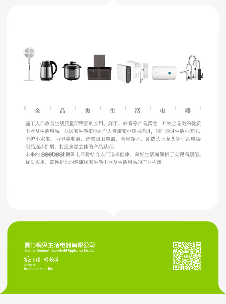厦门视贝科技有限公司是集产品自主设计,研发,生产,销售于一体的高科技企业。拥有80000平方米的制造厂房,核心员工2000多人。产品线涵盖照明、电工,卫浴,线路,集成风暖等领域。