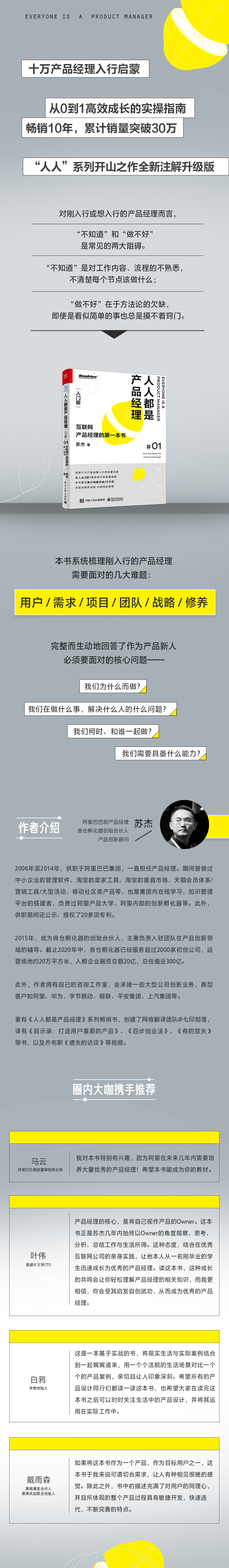 苏杰阿里巴巴前产品经理良仓孵化器创始合伙人产品创新顾问 2006年至2014年,供职于阿里巴巴集团,一直担任产品经理。期间曾做过中小企业的管理软件、淘宝的卖家工具、淘宝的垂直市场、天猫会员体系/营销工具/大型活动、移动社区类产品等,也是集团内在线学习、知识管理平台的搭建者,负责过阿里巴巴产品大学、阿里巴巴内部的创新孵化器等。此外,供职期间还公示、授权了20多项专利。 2015年,成为良仓孵化器的创始合伙人,主要负责入驻团队在产品创新领域的辅导。截止2020年中,良仓孵化器已经服务超过2000家初创公司,运营场地约20万平方米,入孵企业融资总额20亿,总估值近300亿。此外,作者拥有自己的咨询工作室,会承接一些大型公司的创新业务,典型客户如阿里巴巴、华为、字节跳动、中国银联、平安集团、上海汽车等。著有系列畅销书《人人都是产品经理》《人人都是产品经理2.0》《淘宝十年产品事》,创建了网络翻译团队@七印部落,译有《启示录:打造用户喜爱的产品》《四步创业法》《有的放矢》等书,以及乔布斯《遗失的访谈》等视频。