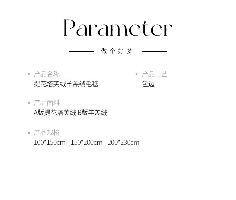 | 【品名】塔芙蓉羊羔绒毛毯 9色可选 【颜色】茶绿色,姜黄色,咖啡色,卡其色,蓝色,玫瑰粉,米杏色,莫奈紫,深灰色 【尺寸】100*150cm,150*200cm,200*230cm 【重量】 1米:0.85 公斤左右 1.5米:1.5公斤左右 2米 :2.2公斤左右 【发货包装】独立包装袋 【发货地】江苏 【发货快递】极兔 ,韵达,邮政 【不发货区域】新疆、西藏、青海,港澳台 【发货时效】48小时,周末节假日顺延 |