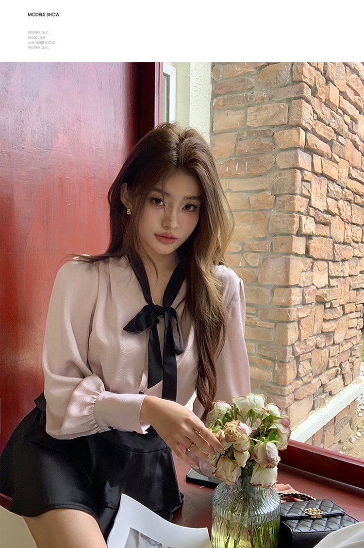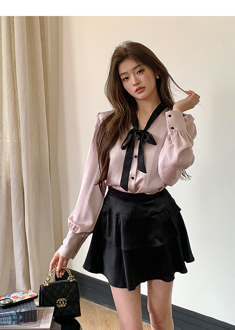 西遇法式粉色衬衫女2025年新款缎面泡泡袖系带v领开衫上衣SS150142