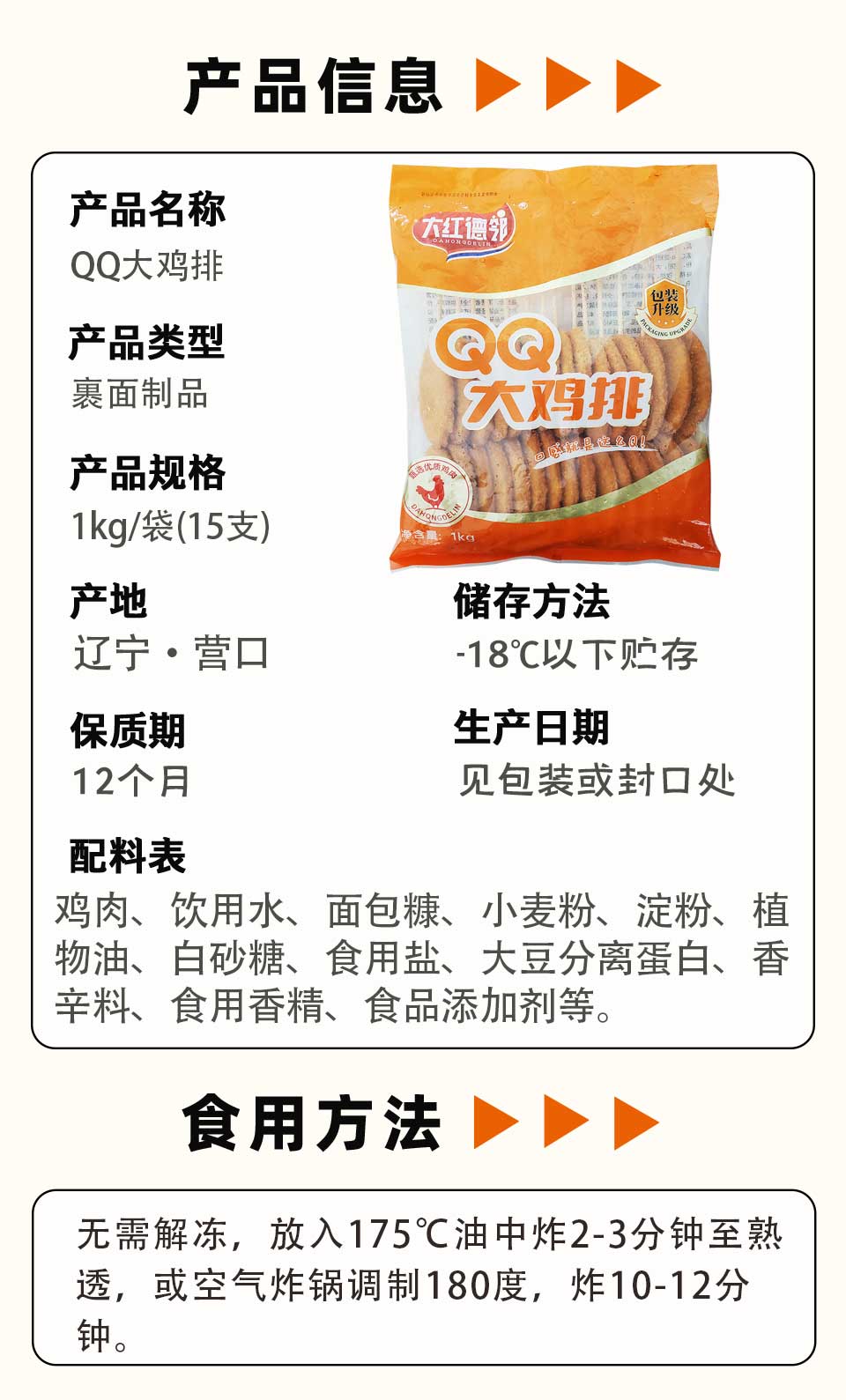 H大红德邻QQ大鸡排 1kg/袋(15支) 8袋/件
