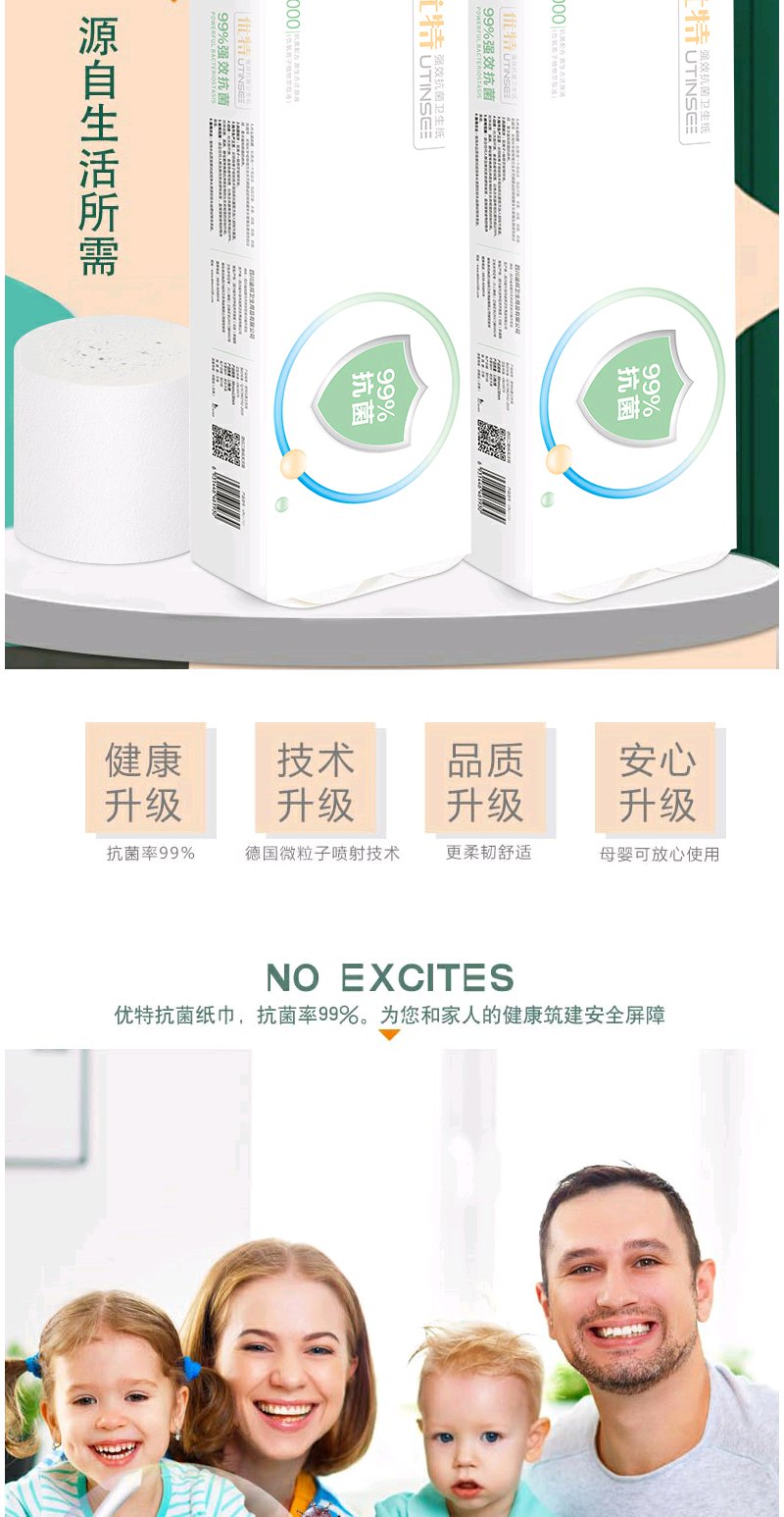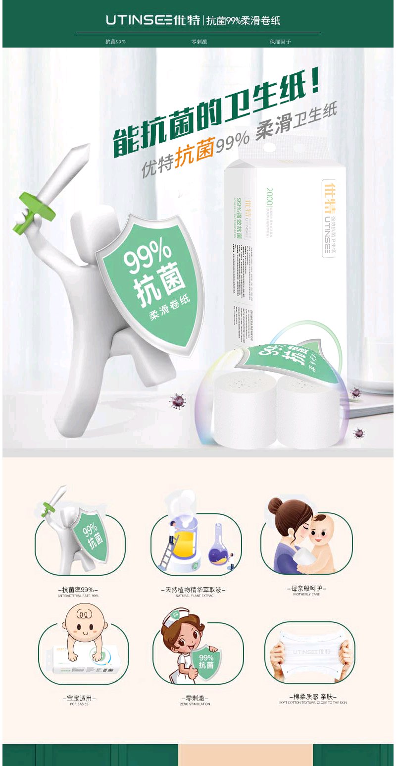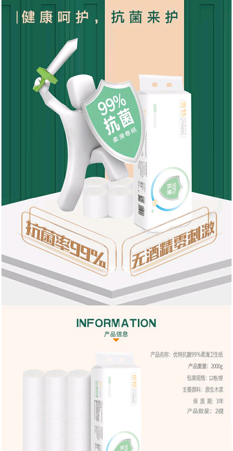 【植物萃取精华】优特抗菌卷纸植物萃取抑菌成分抑菌无刺激幼儿也能用纸巾2000g×2提12卷每提