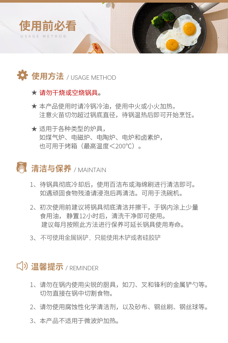 注意:本产品不可使用钢铲,只可使用硅胶/木铲/尼龙铲