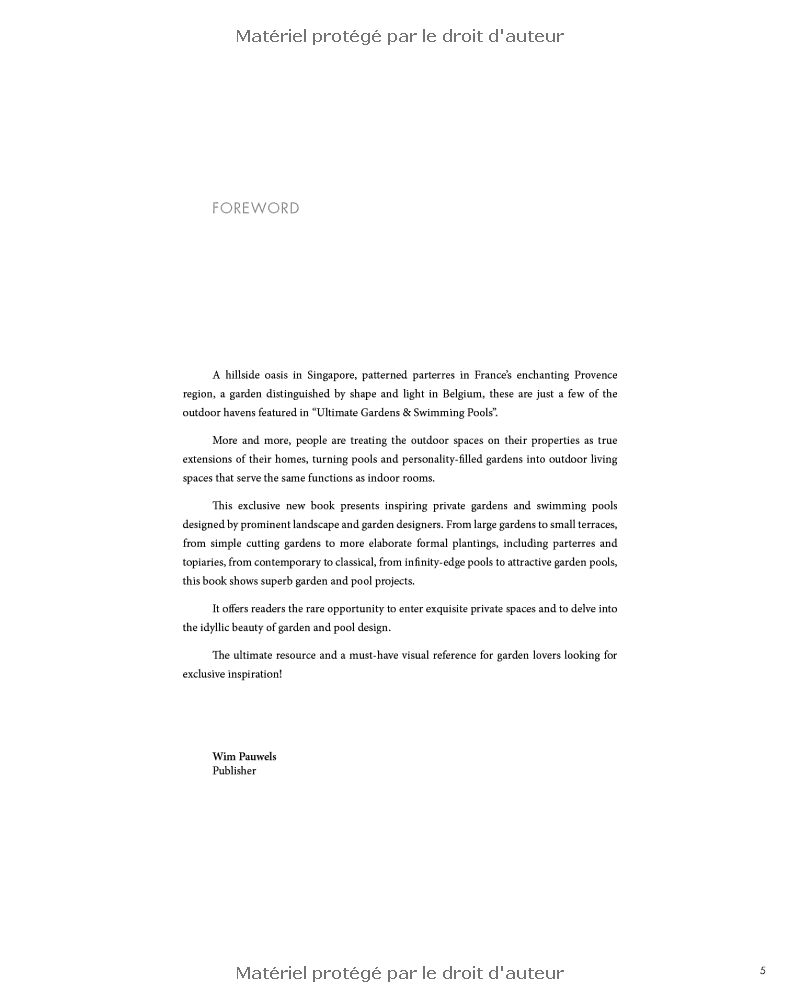 "This book features some of the world's most beautiful private gardens and swimming pools, realized by the best garden and landscape architects working today.Includes private gardens from the UK, France, Belgium, and Hong Kong.Text in English and French."
