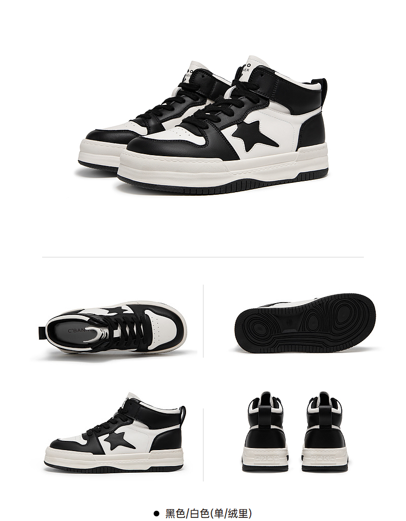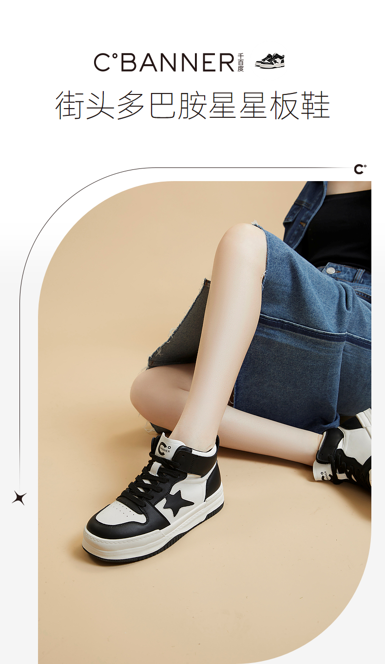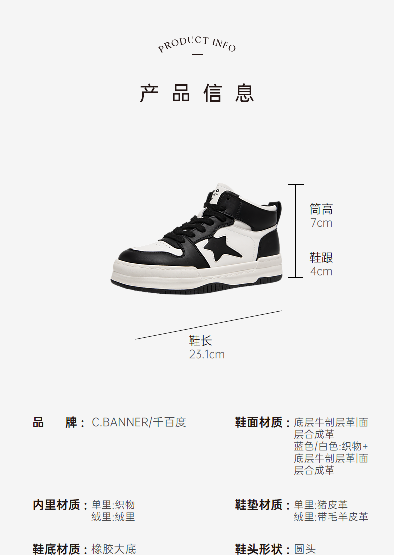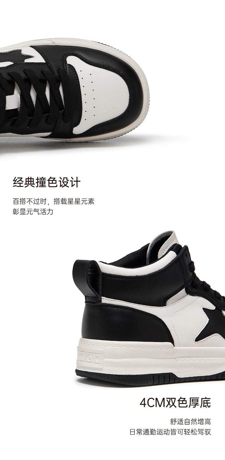 千百度女鞋厚底高帮黑白鞋秋冬增高板鞋舒适休闲运动鞋A23512507