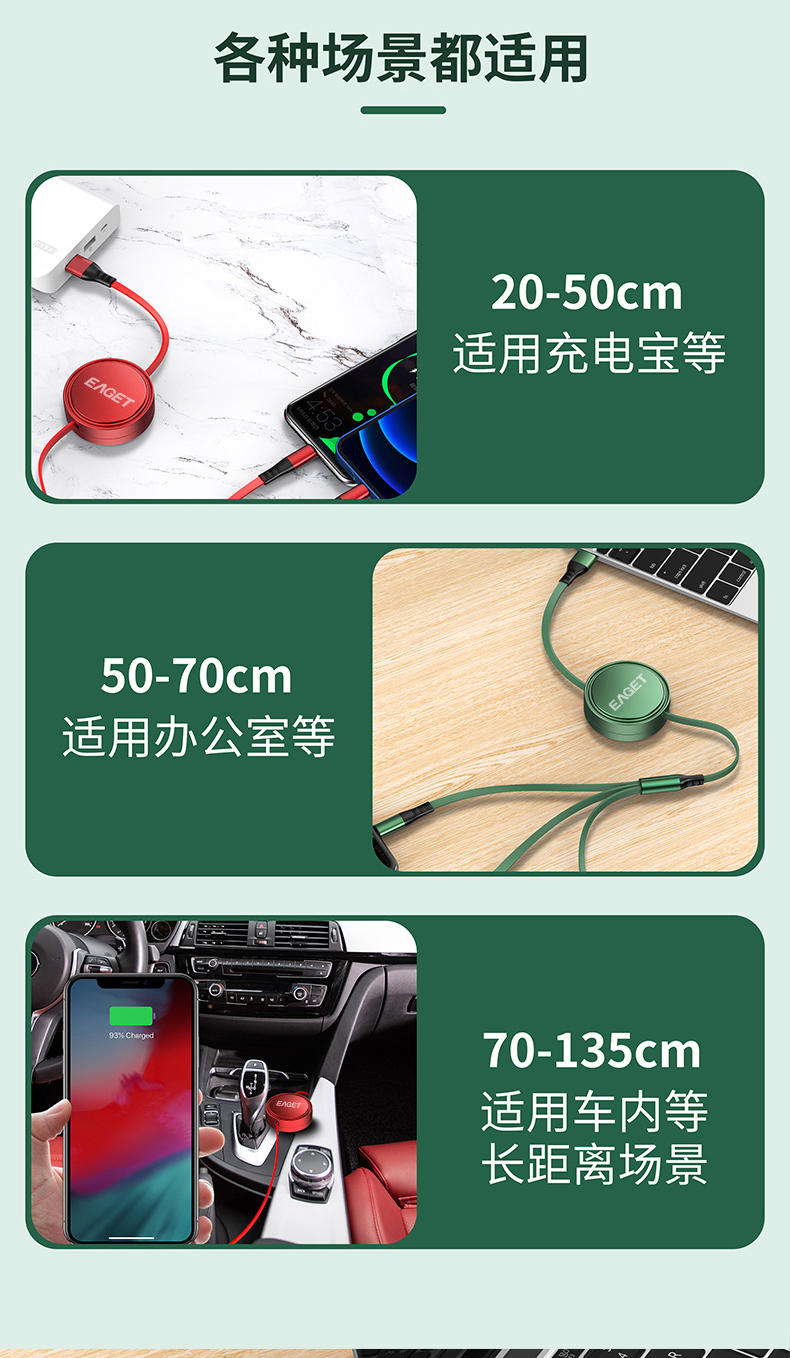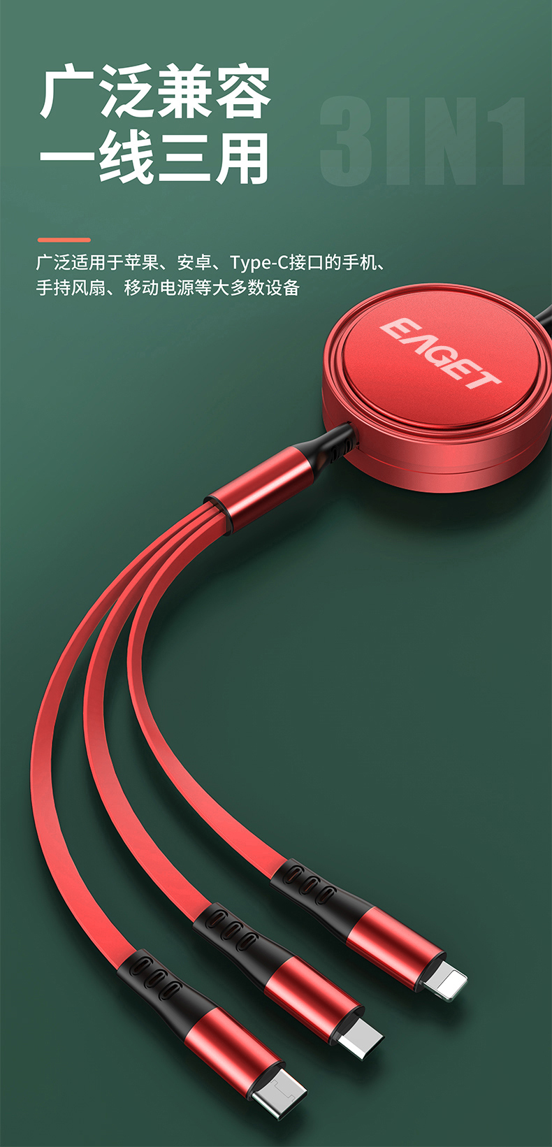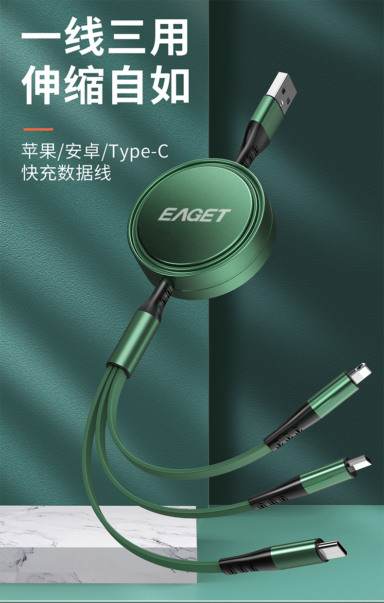 忆捷EC010数据线三合一充电器线伸缩一拖三车载快充线适用苹果12Type-C华为安卓手机