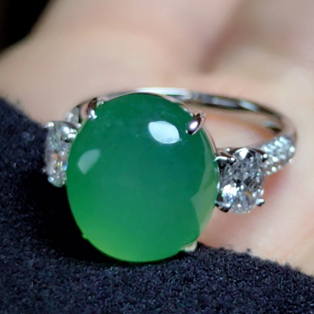 “泓”为水之深广,戒身翠色恰是曲水蜿蜒处沉淀的碧,带着玉石特有的清寒之气,却在莹润水头的映衬下,暖而不燥、冷而不冽。蛋面饱满莹润,仿若从千年溪涧中撷取的翠魄,未经尘俗惊扰,只留纯粹的绿,一汪凝在指尖,似要漫出层层清辉,恰如曲水流觞时,杯中漾开的粼粼波光。