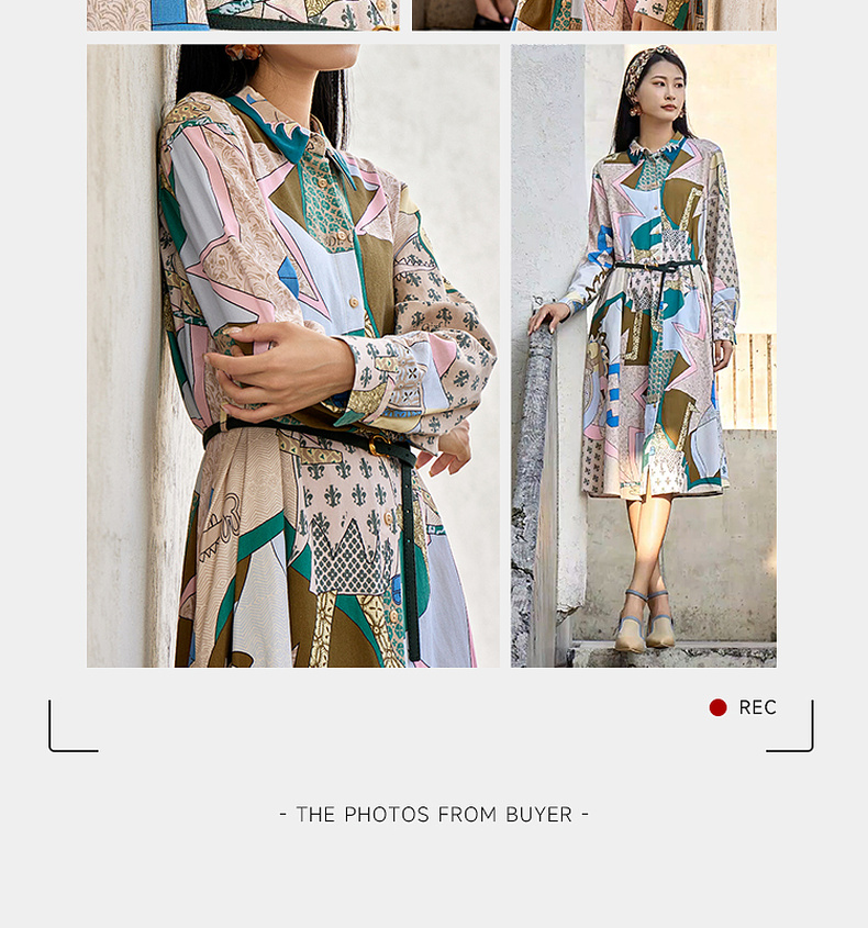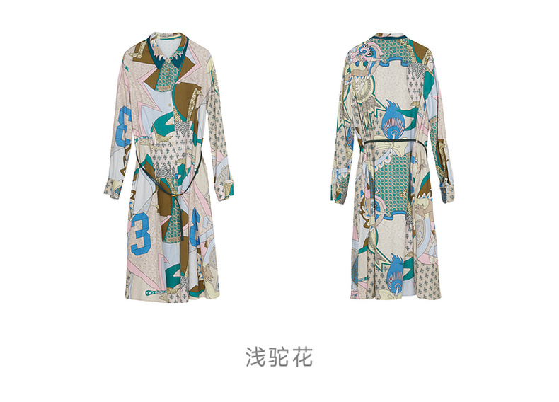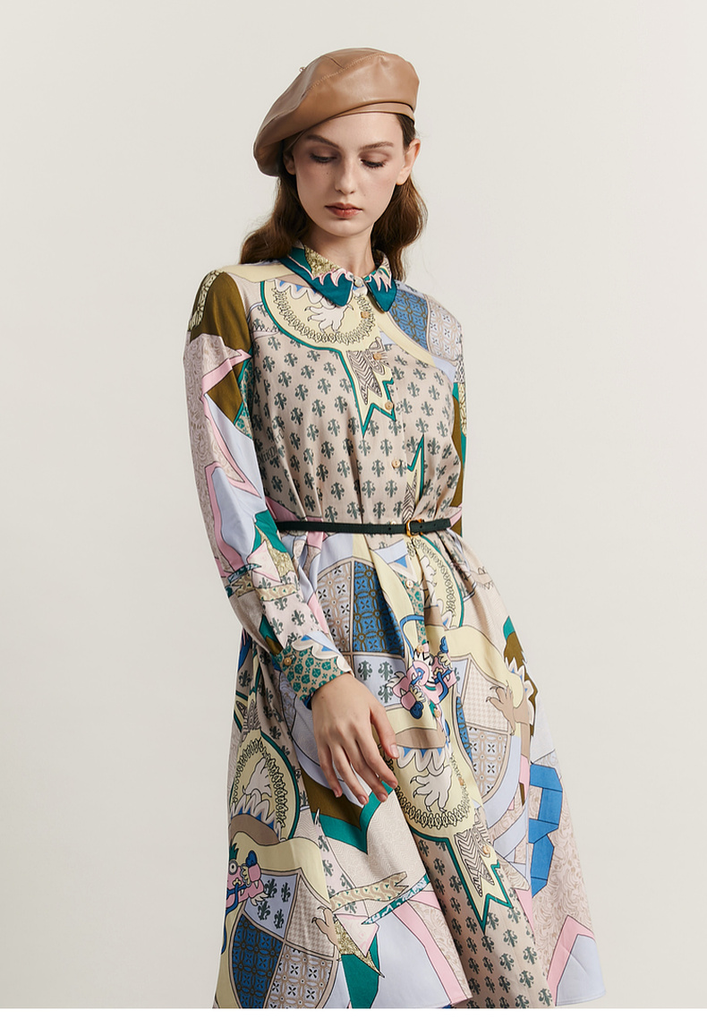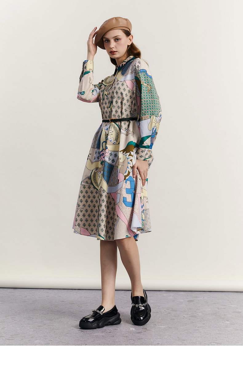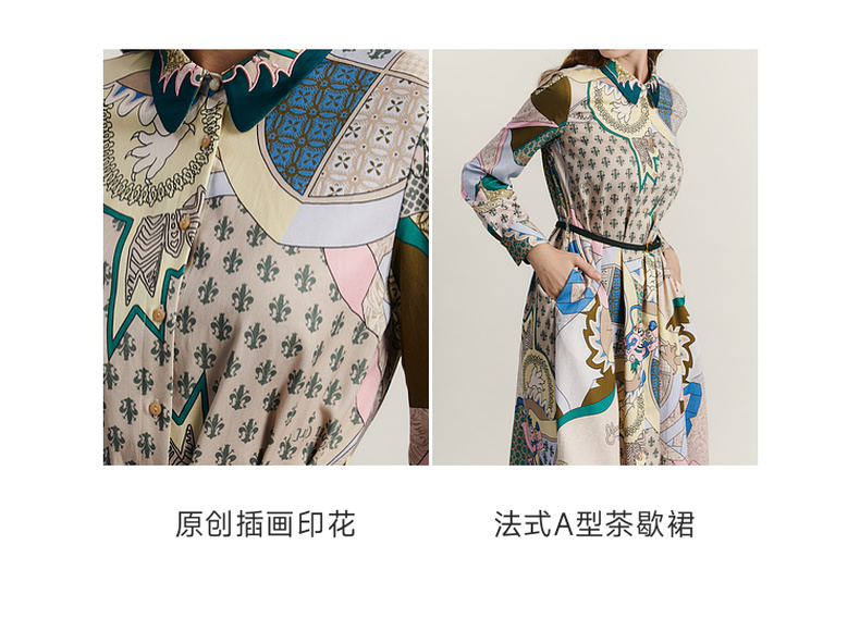 谜底花色连衣裙长袖2023冬新品复古田园风中长裙配腰带234ML1519