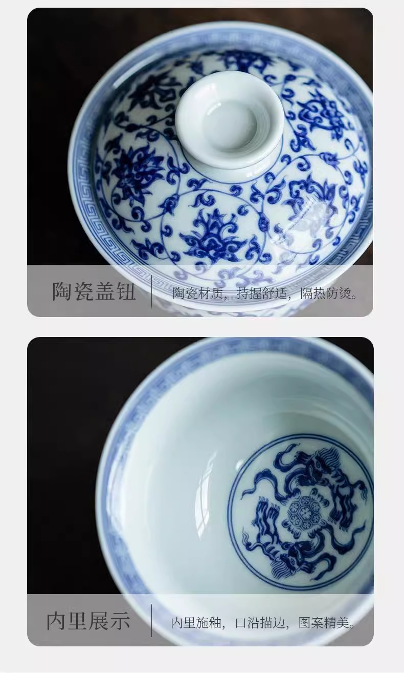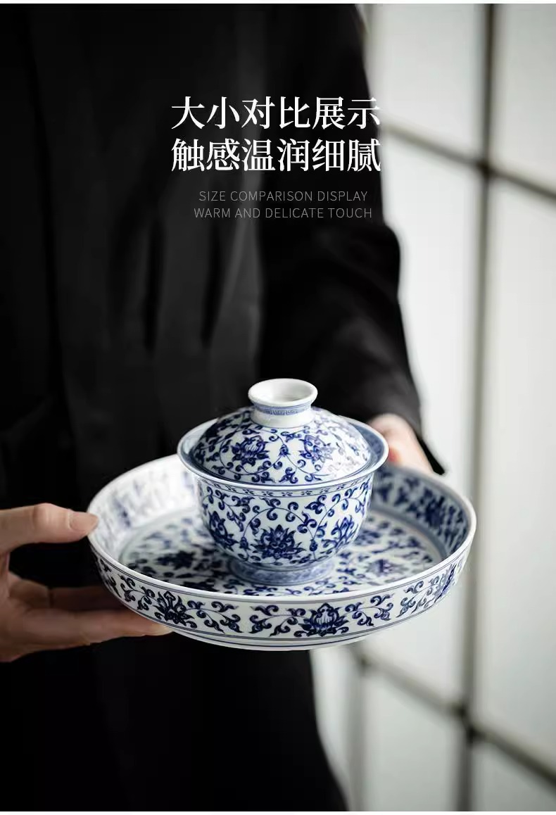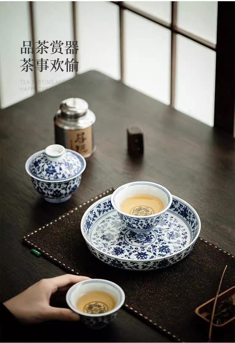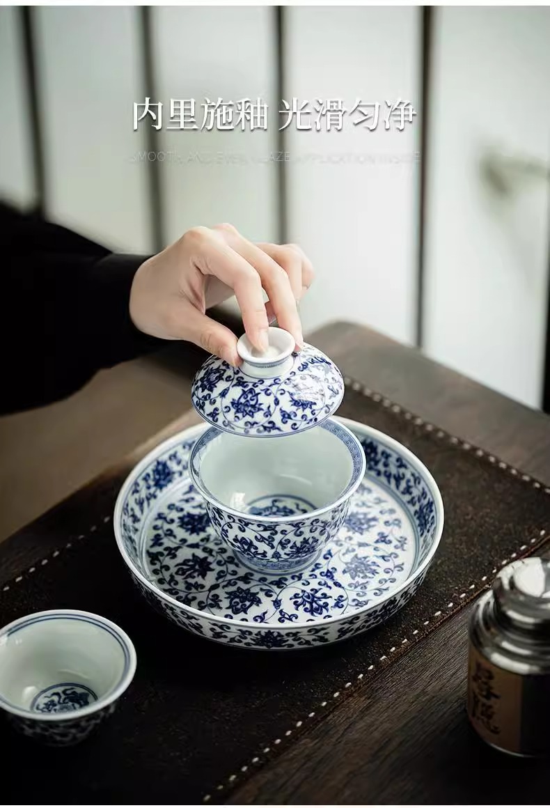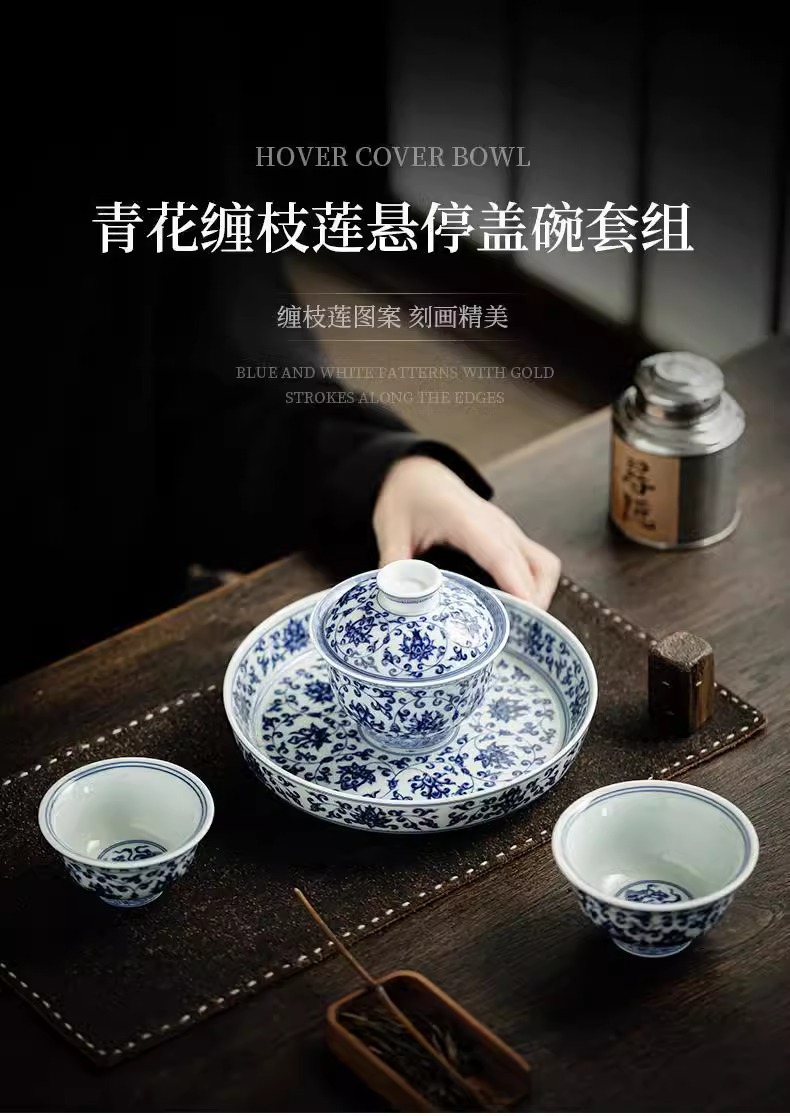 成艺陶瓷 永乐缠枝莲悬停盖碗10入功夫茶具套装釉下彩复古家用壶承成艺永乐缠枝莲悬停盖碗套组10入
