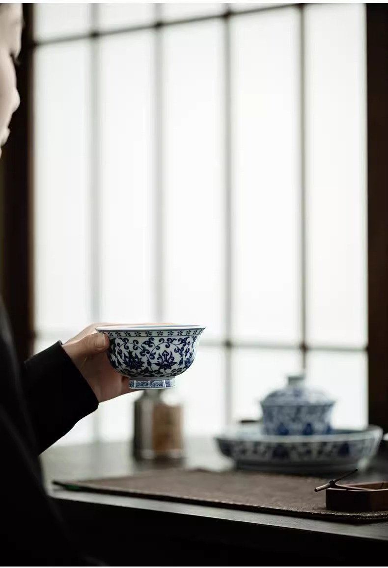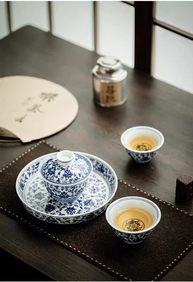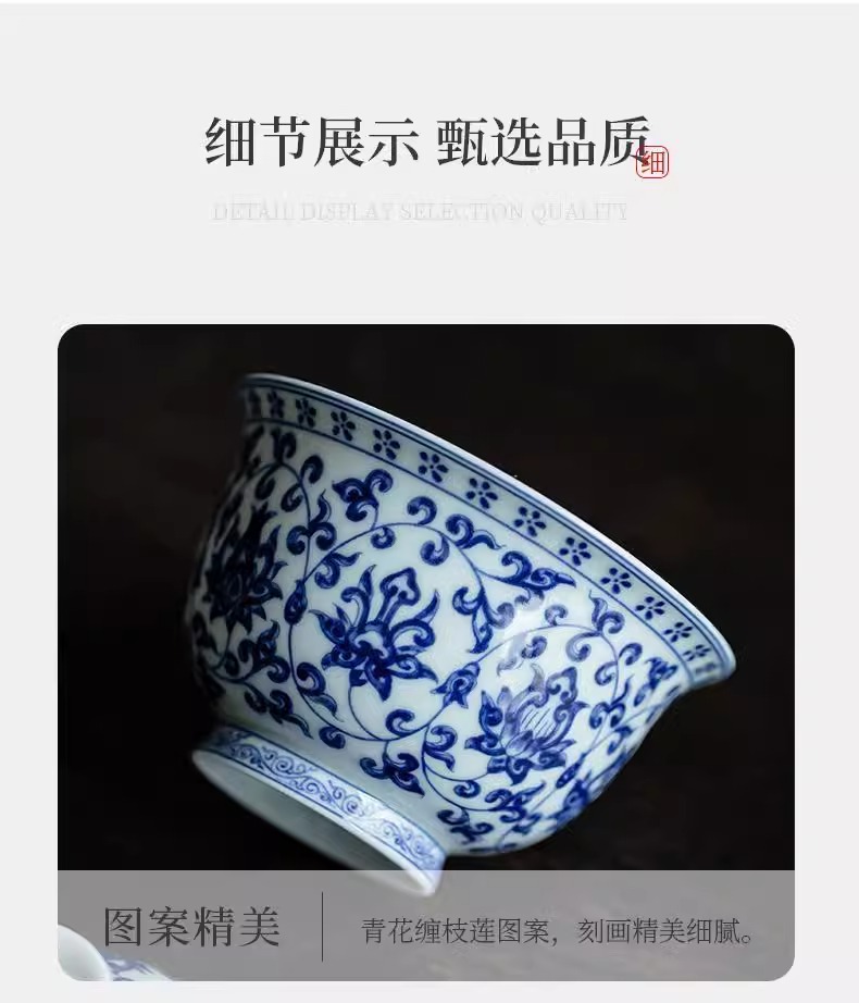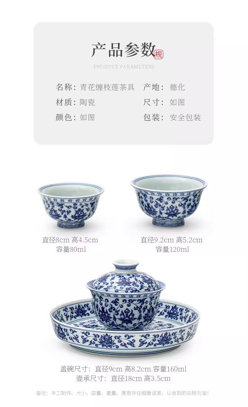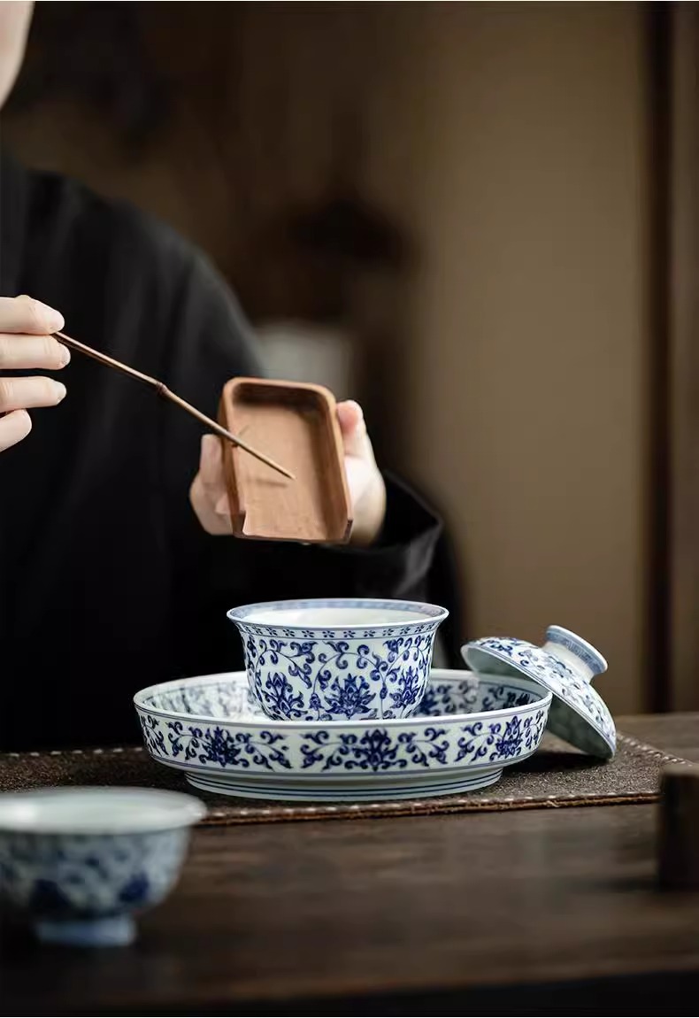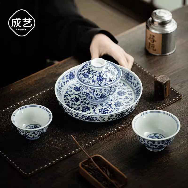 成艺陶瓷 永乐缠枝莲悬停盖碗10入功夫茶具套装釉下彩复古家用壶承成艺永乐缠枝莲悬停盖碗套组10入