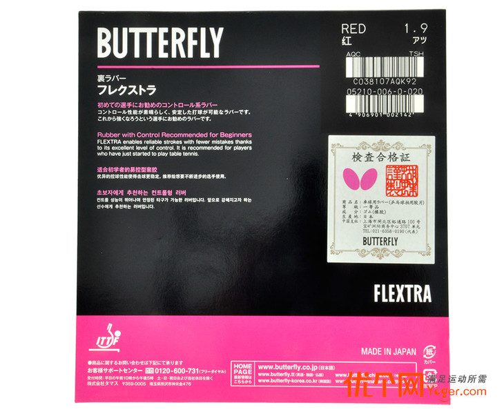 蝴蝶Butterfly FLEXTRA乒乓球反胶套胶-05210(小蝴蝶) 包装背面: