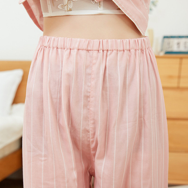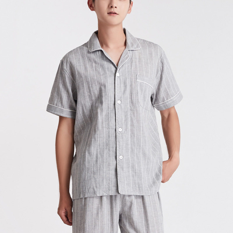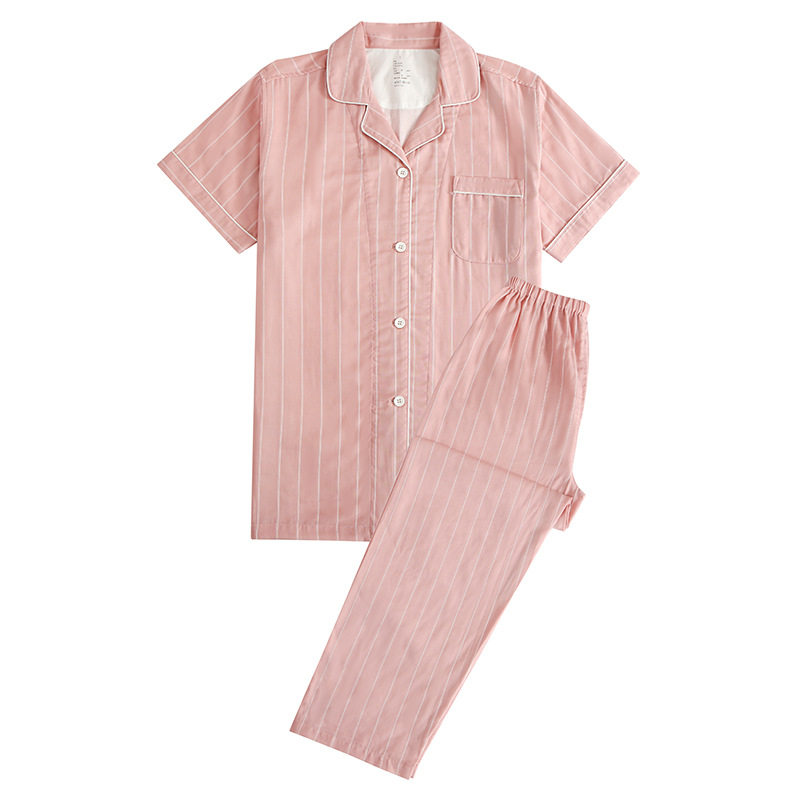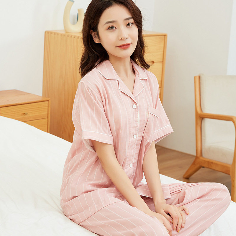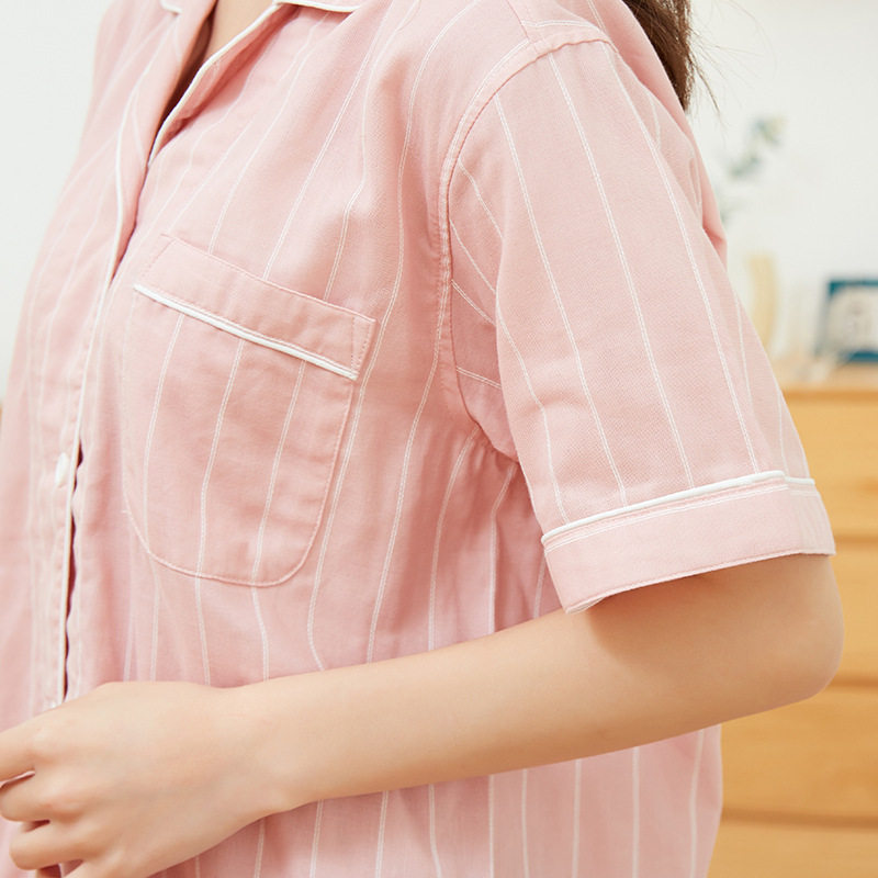 日系无印双层纱短袖家居服良品短袖全棉男女情侣竖条纹短袖长裤